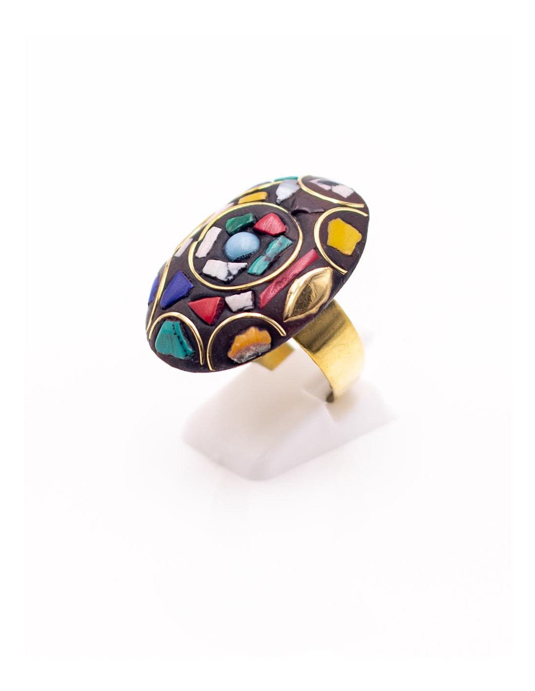 Anillo artesanal Kimago con varias piedras minerales y detalles dorados de inspiración india.