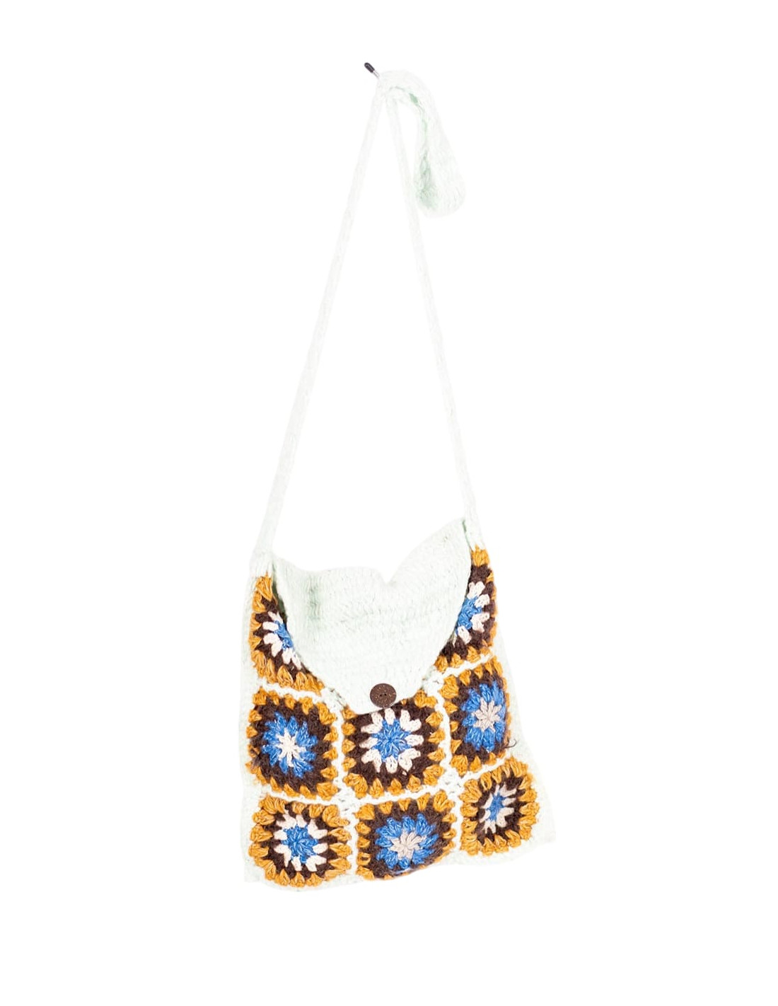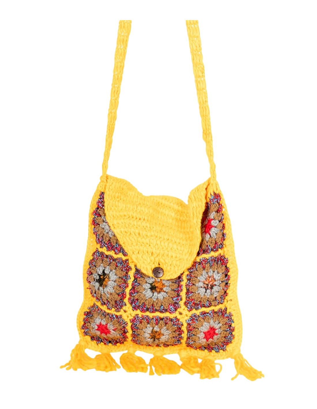El cuerpo principal se cierra con un botón de madera, reflejando una combinación perfecta de funcionalidad y estilo. Sus dimensiones son de 33 cm de alto por 29 cm de ancho, con adorables flecos en la parte inferior que añaden un toque de exotismo a su diseño. La correa larga y tejida asegura un cómodo transporte, permitiendo que la bandolera se adapte a tu estilo de vida.