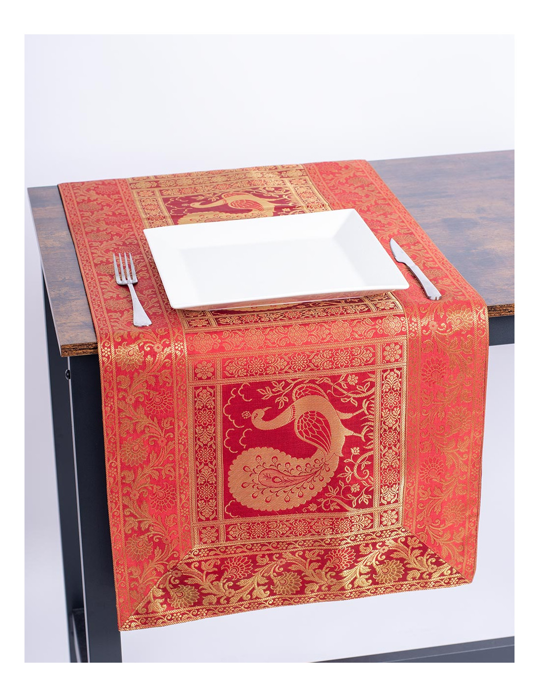 Camino de mesa decorativo de fondo rojo con dibujos de pavo real en colores dorados brillosos