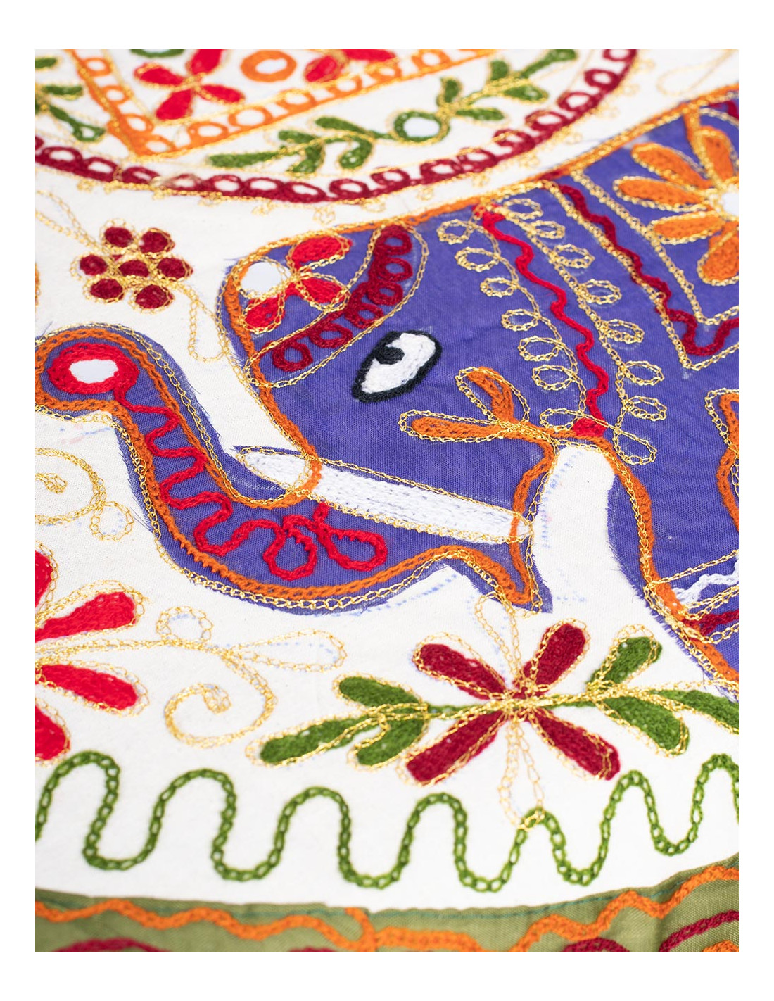 Este mantel o centro de mesa circular, cuidadosamente bordado a mano, presenta un diseño central de cuatro elefantes en círculo, rodeados de una vibrante variedad de flores coloridas.