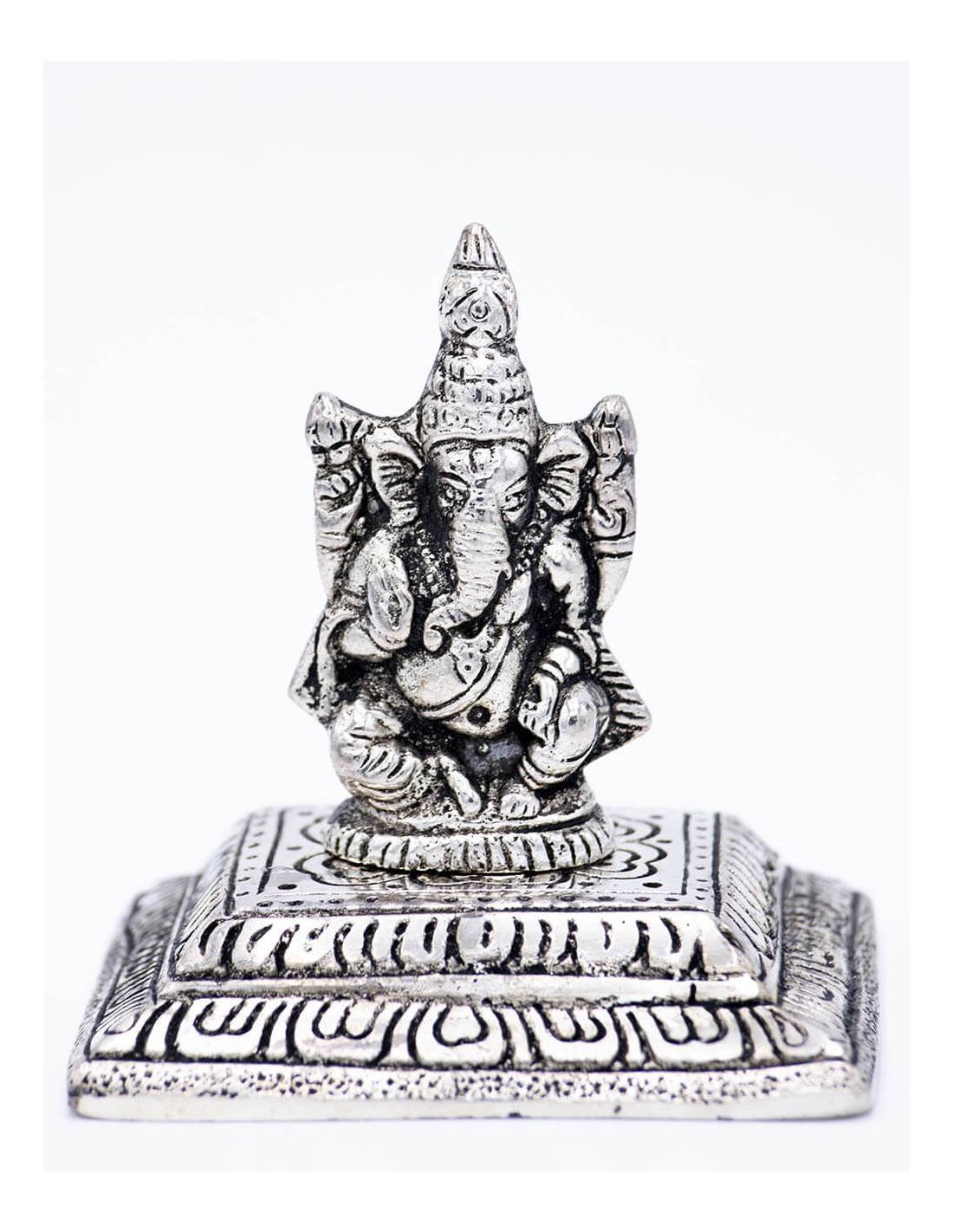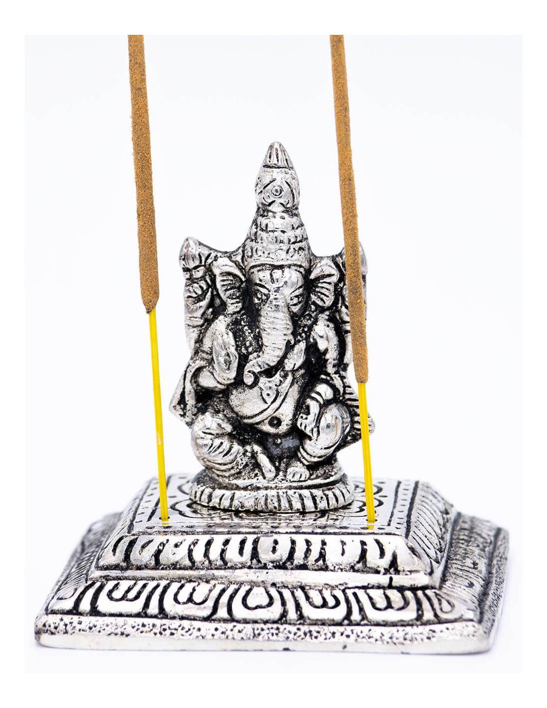 Estatua de metal y quemador de incienso a la ve. Posee una gran base circular y la figura del dios Ganesha en el centro.