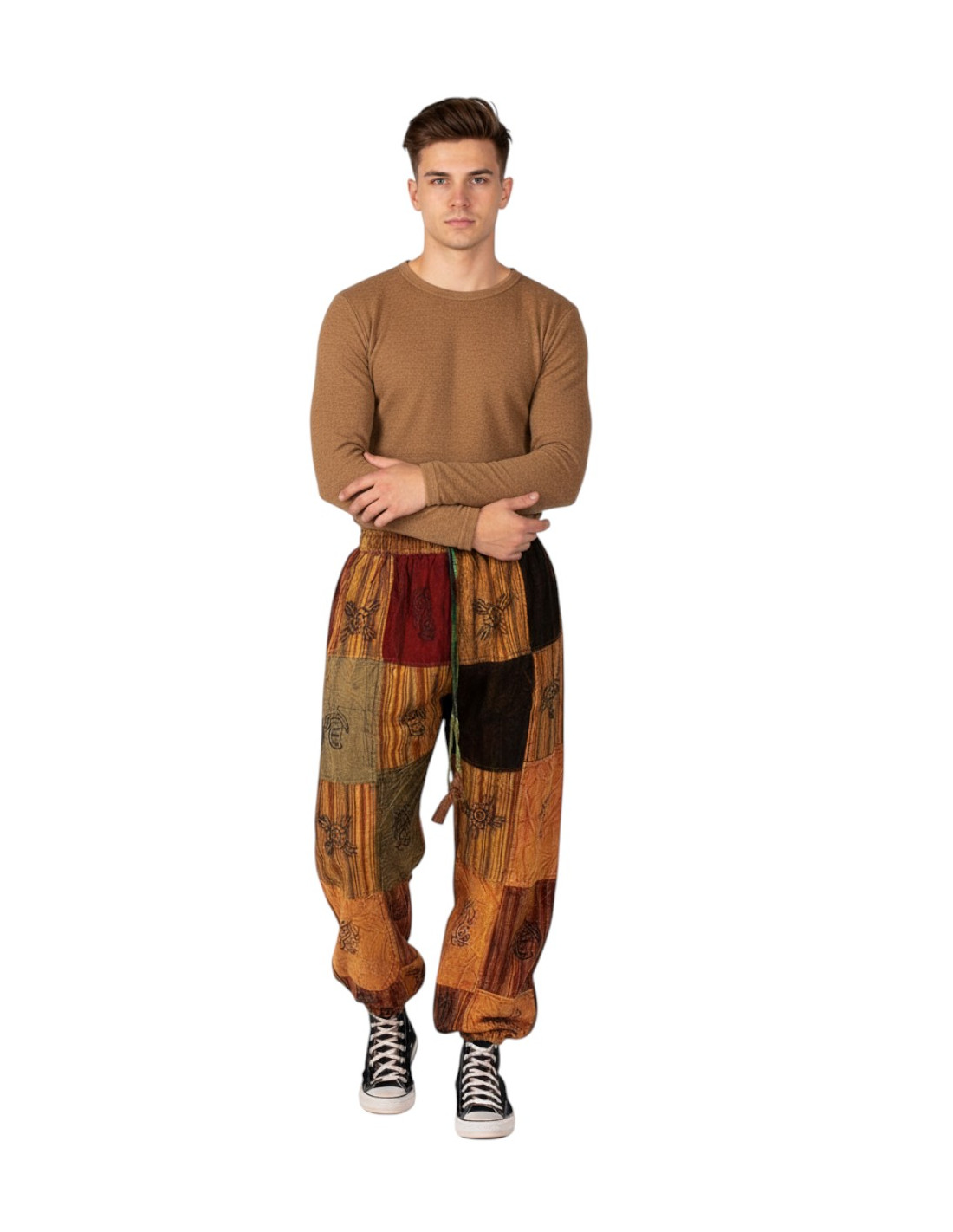 Pantalón unisex en algodón con patchwork único, cintura y tobillos elásticos, bolsillos laterales y lazo decorativo.