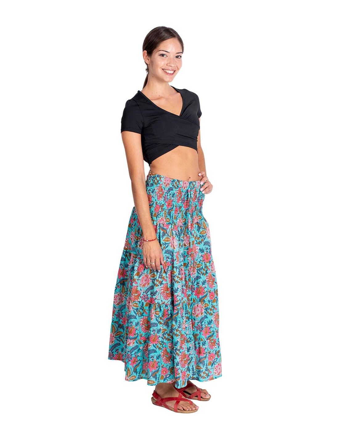 Falda larga de estilo hippie con goma ancha en la cintura.