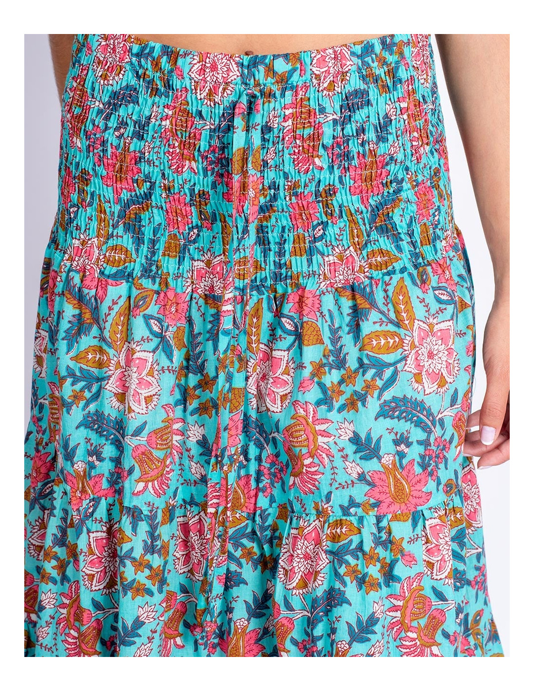 Pantalón recto y fino fabricado en seda con dibujos paisley en color azul con dibujos de flores en varios colores