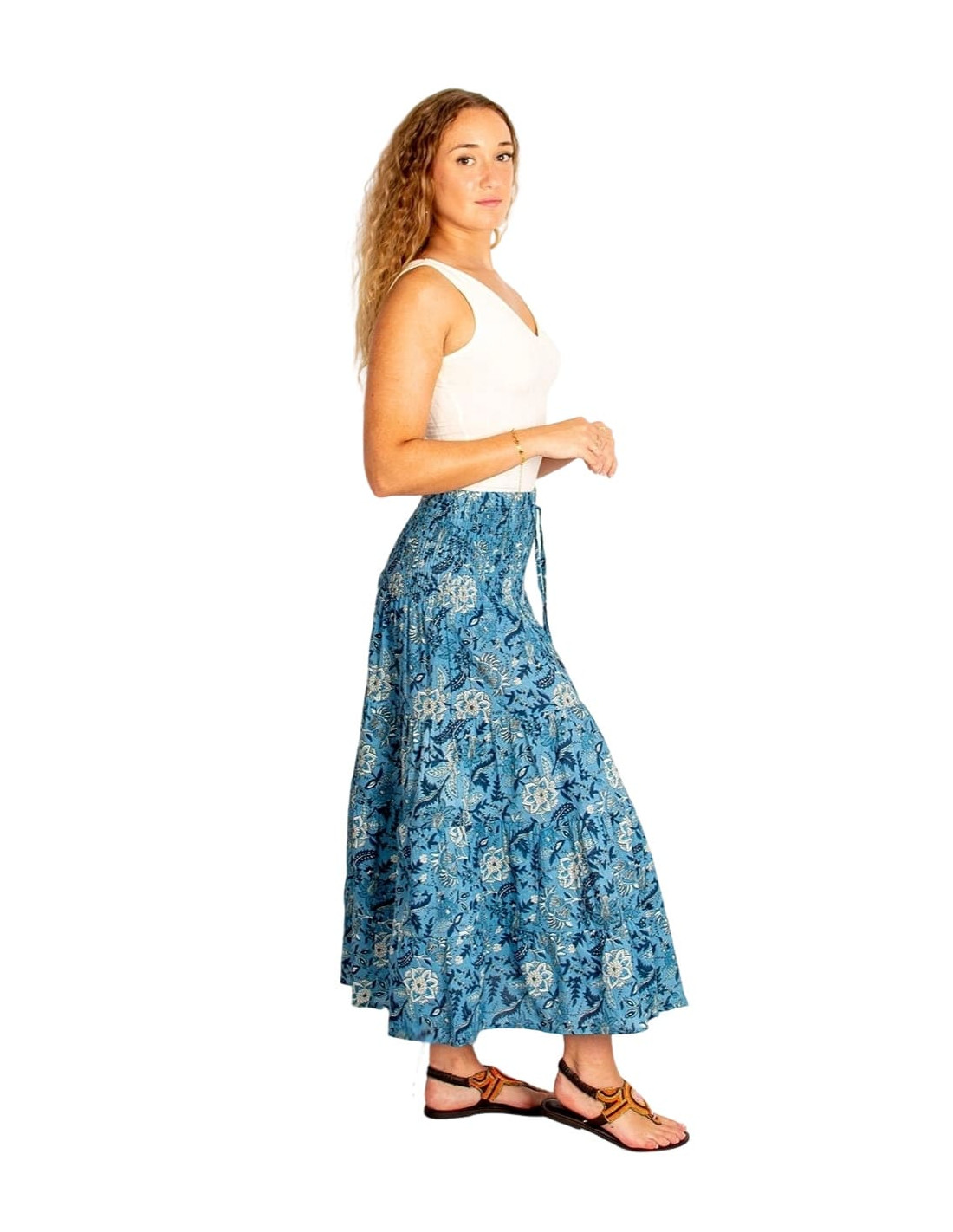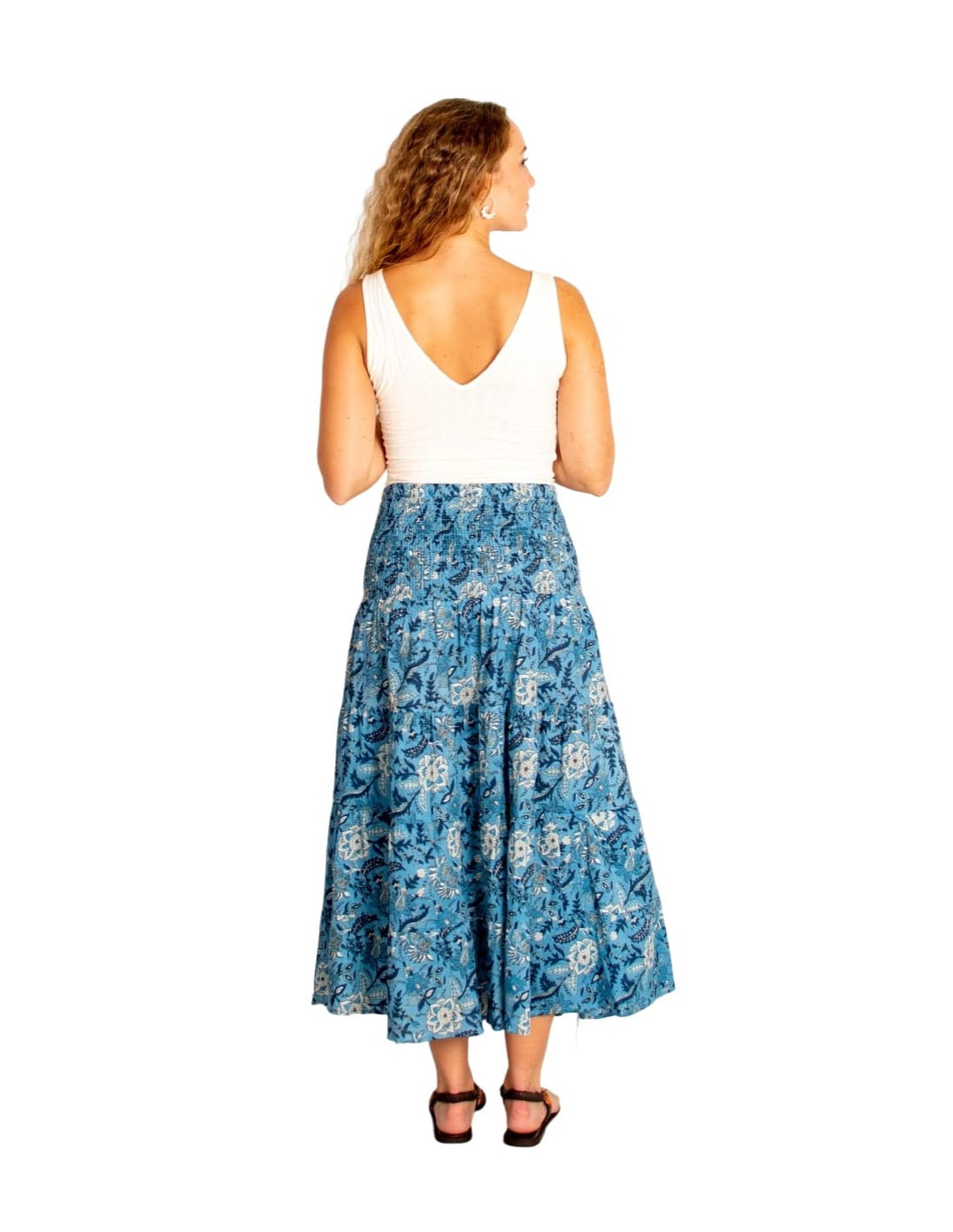Falda larga de algodón con estampado floral azul y blanco. Cómoda, fluida y versátil para lucir moda étnica durante todo el año.