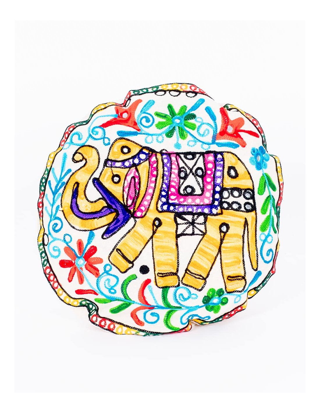 Funda de cojin redondo con base color blanco roto y gran variedad de colores en los bordados