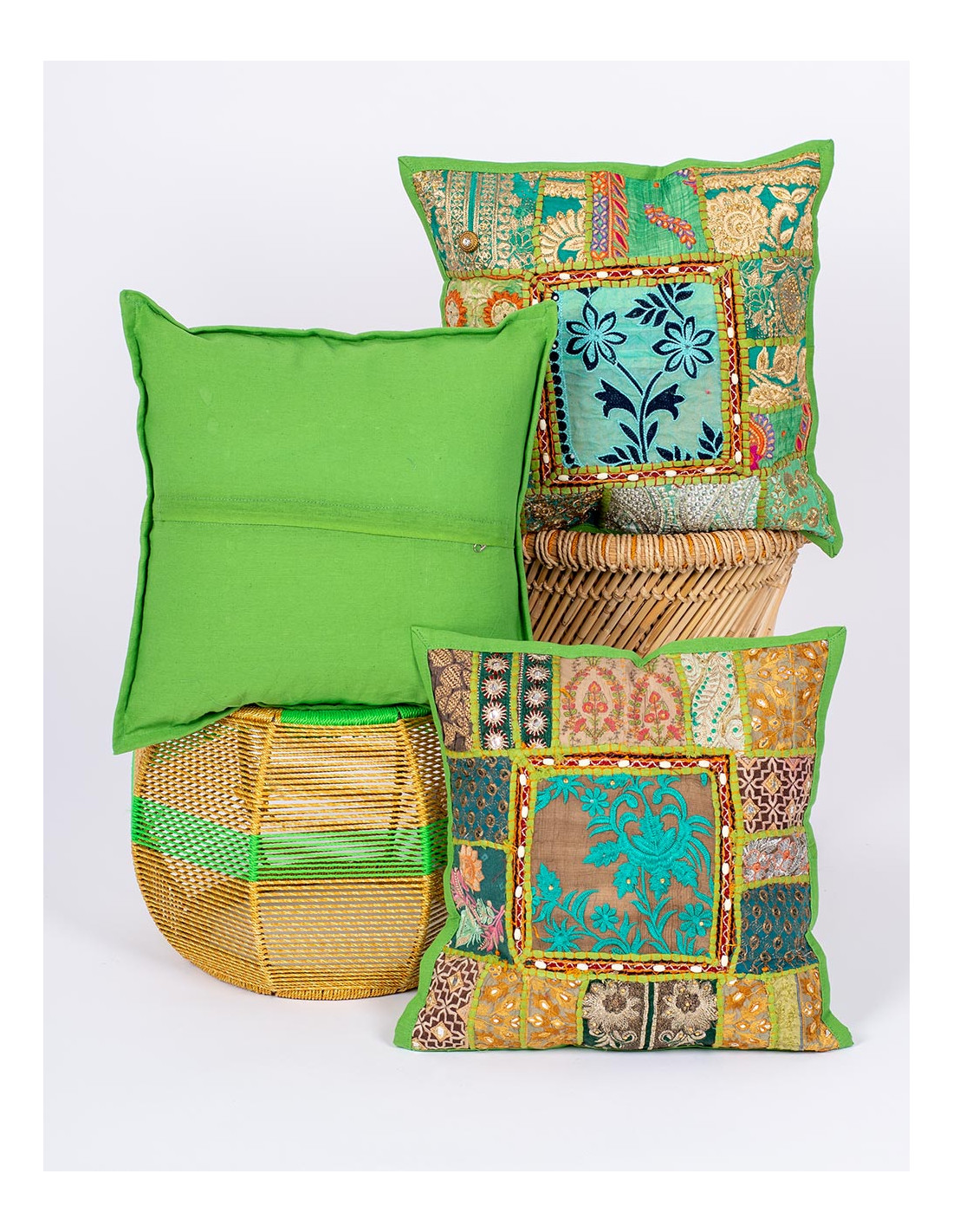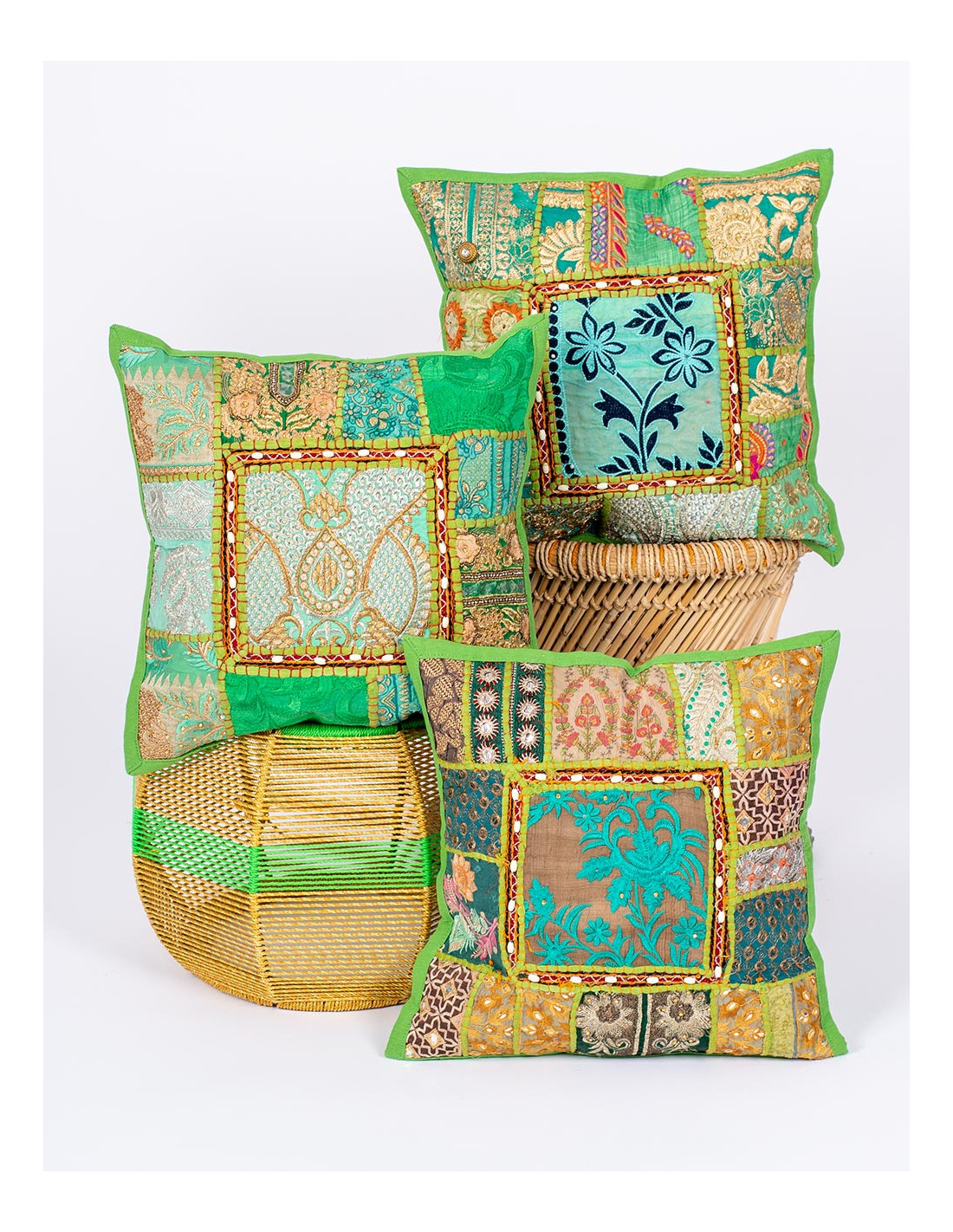 Cada pieza presenta variaciones en colores y disposición de los tejidos, manteniendo siempre una armonía visual cuidada. Con unas medidas de 40 x 40 cm, se entrega de forma aleatoria, convirtiendo cada funda en un artículo exclusivo de decoración boho y artesanía india.