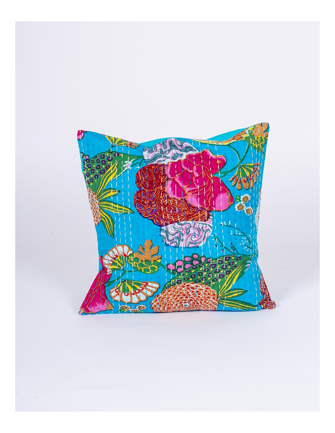 La funda de cojín Kimago es una pieza decorativa que refleja la esencia de la artesanía textil india y el valor de lo hecho a mano. Confeccionada en algodón, presenta un delicado estampado floral multicolor sobre una base celeste, realzado con pespuntes decorativos que aportan textura y carácter.