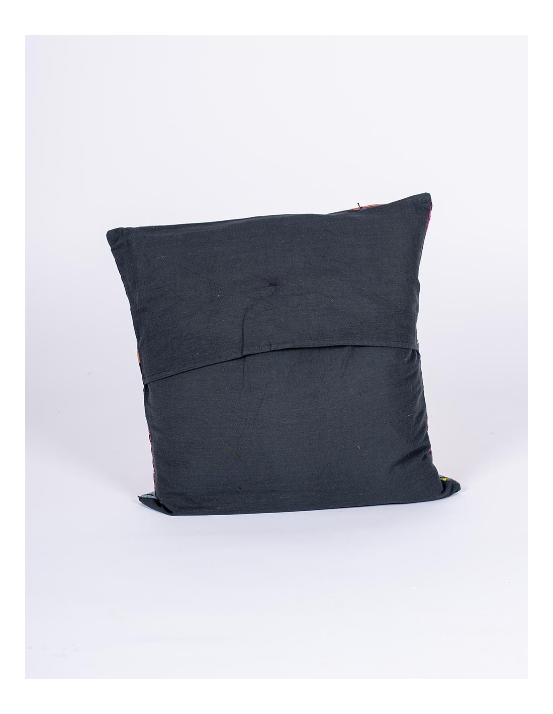 La parte trasera es lisa y uniforme, en el mismo tono negro, e incluye cierre para facilitar el uso. Con medidas 40 x 40 cm, es ideal para ambientes boho, étnicos o contemporáneos que apuestan por la decoración inspirada en la cultura india.
