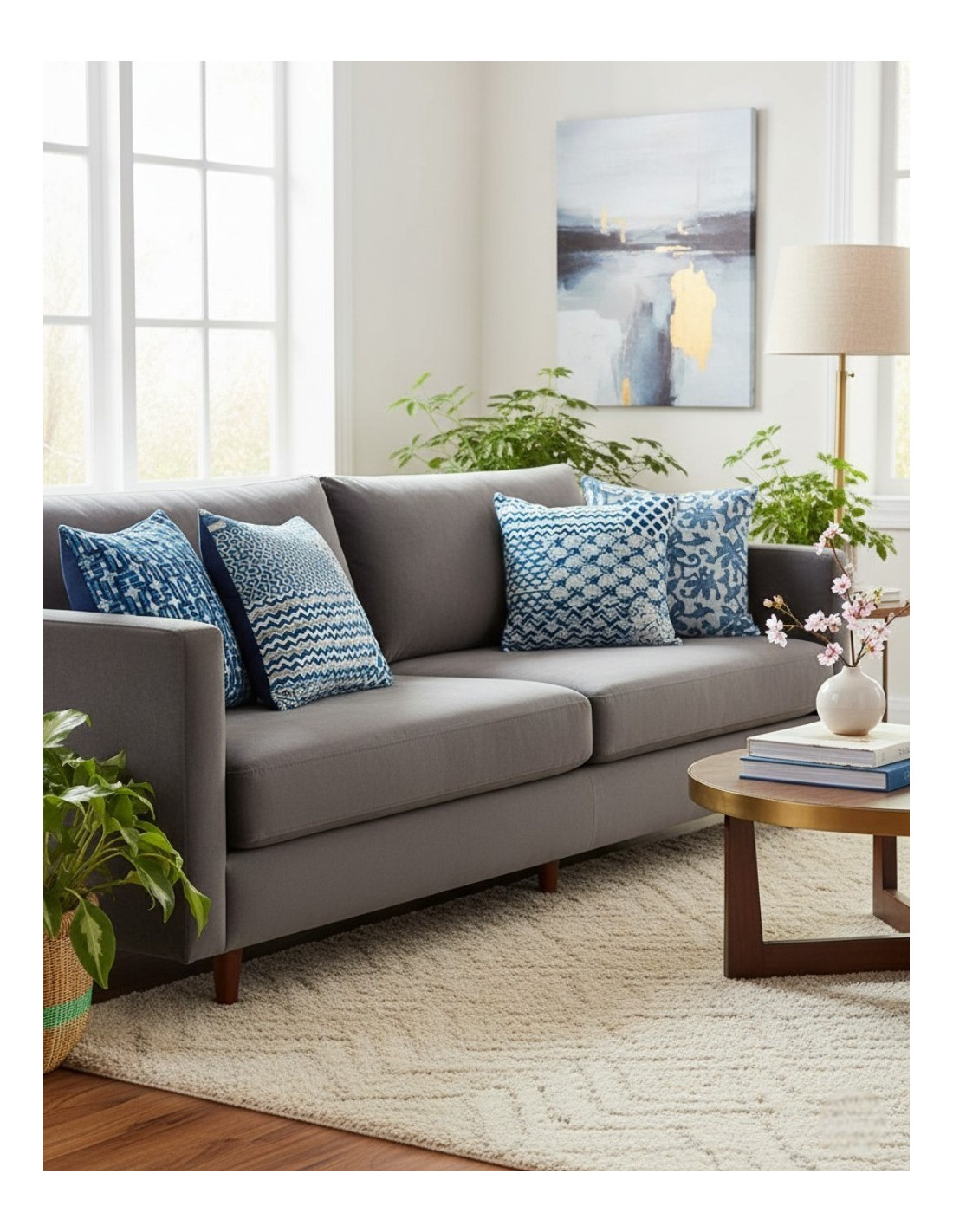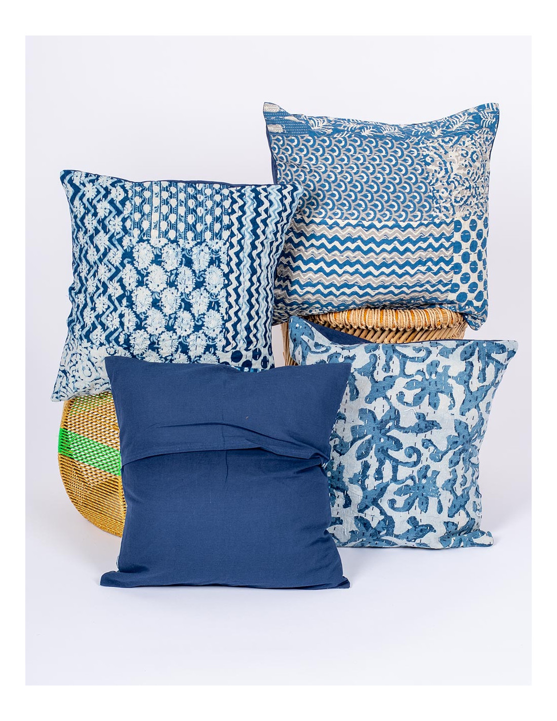La funda de cojín Kimago 40x40 en tonos azul, celeste y blanco es una pieza textil que refleja la riqueza de la artesanía india y el encanto de la decoración étnica.