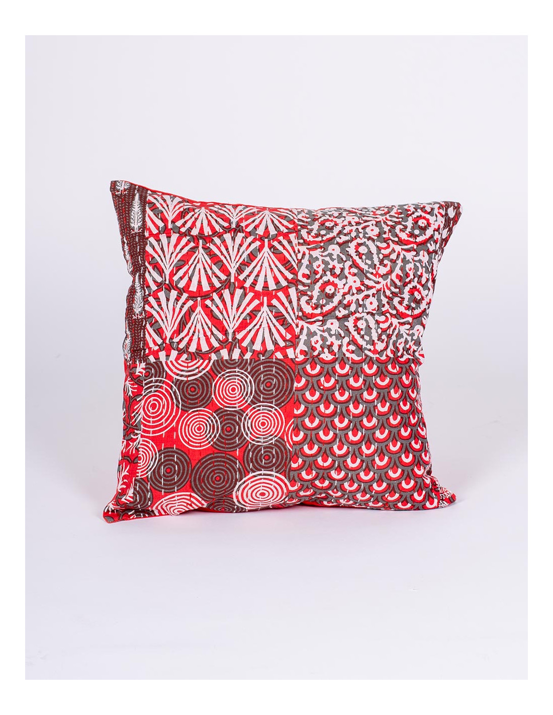 Funda de cojín Kimago en algodón con estampado burdeos y detalles blancos de inspiración india.