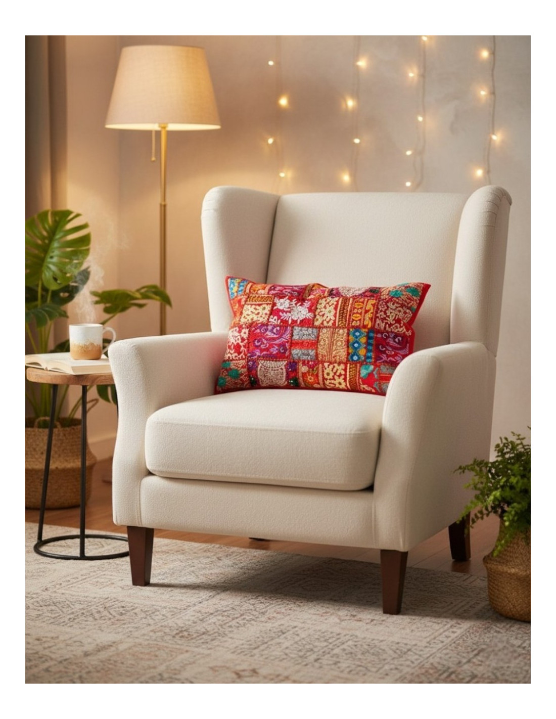 En Kimago trabajamos con talleres artesanos de la India para ofrecer productos auténticos que elevan el posicionamiento de tu tienda. Esta funda de cojín 60x40 está confeccionada mediante técnica patchwork, combinando telas variadas con bordados tradicionales en tonos rojos intensos. Cada unidad es única, lo que incrementa la percepción de exclusividad y facilita la venta por impulso en categorías de decoración étnica.