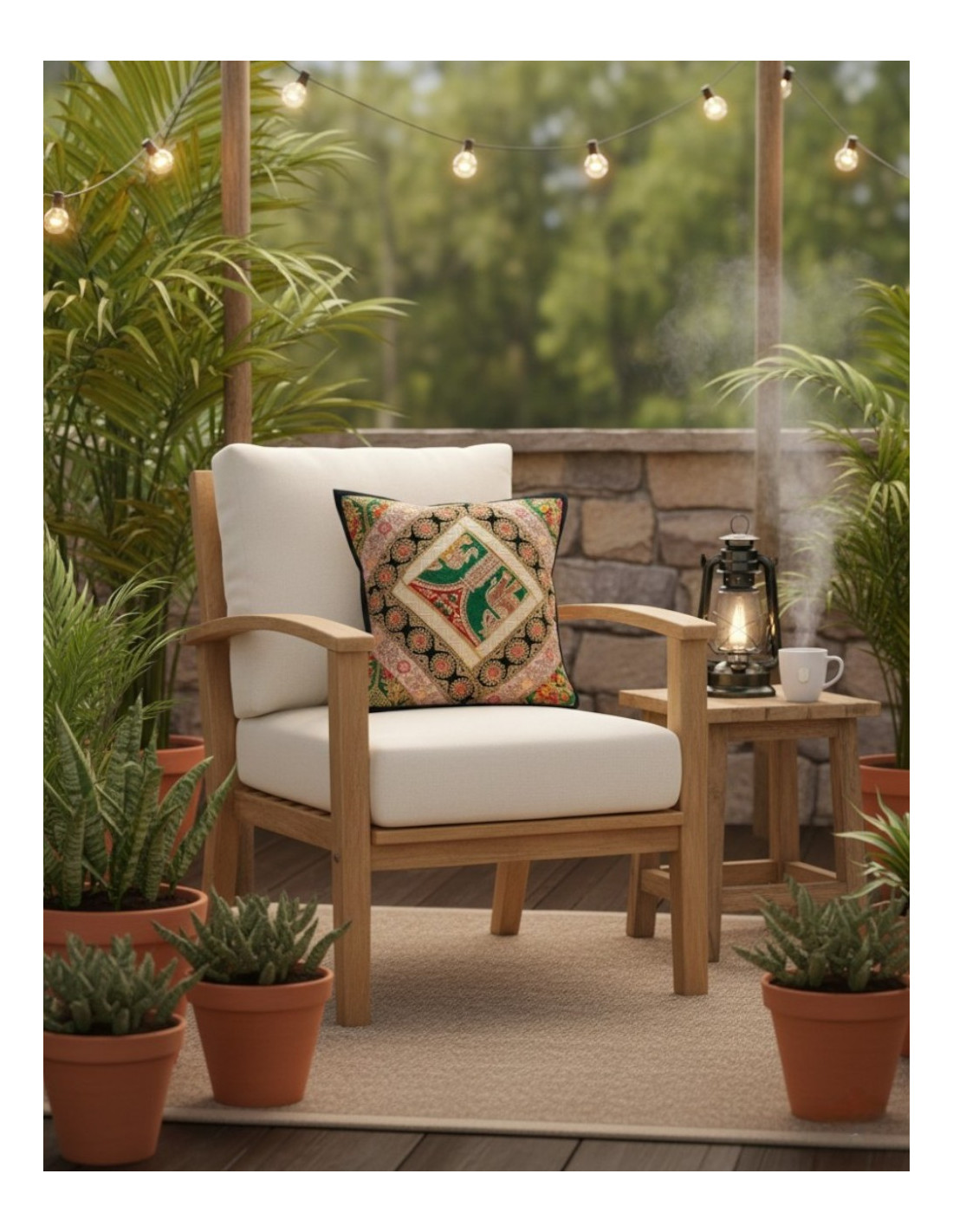 Cuenta con abertura trasera para introducir el relleno (no incluido). Producto enfocado a tiendas de decoración y moda étnica que buscan incrementar el valor medio del pedido (AOV) mediante artículos con fuerte identidad cultural.