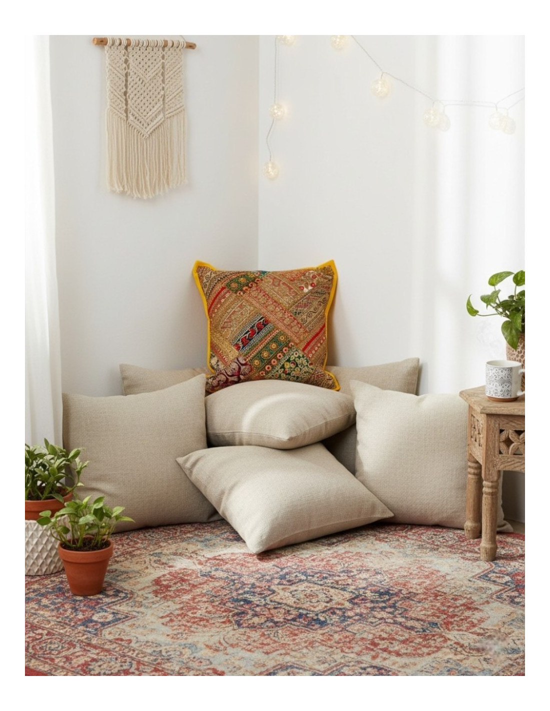 En Kimago seleccionamos artesanía india diseñada para optimizar la diferenciación y rotación en tienda. Esta funda de cojín 40x40 en algodón destaca por su base en color amarillo con bordados artesanales realizados a mano, incorporando detalles brillantes que incrementan la visibilidad del producto y favorecen la conversión en lineal y e-commerce.