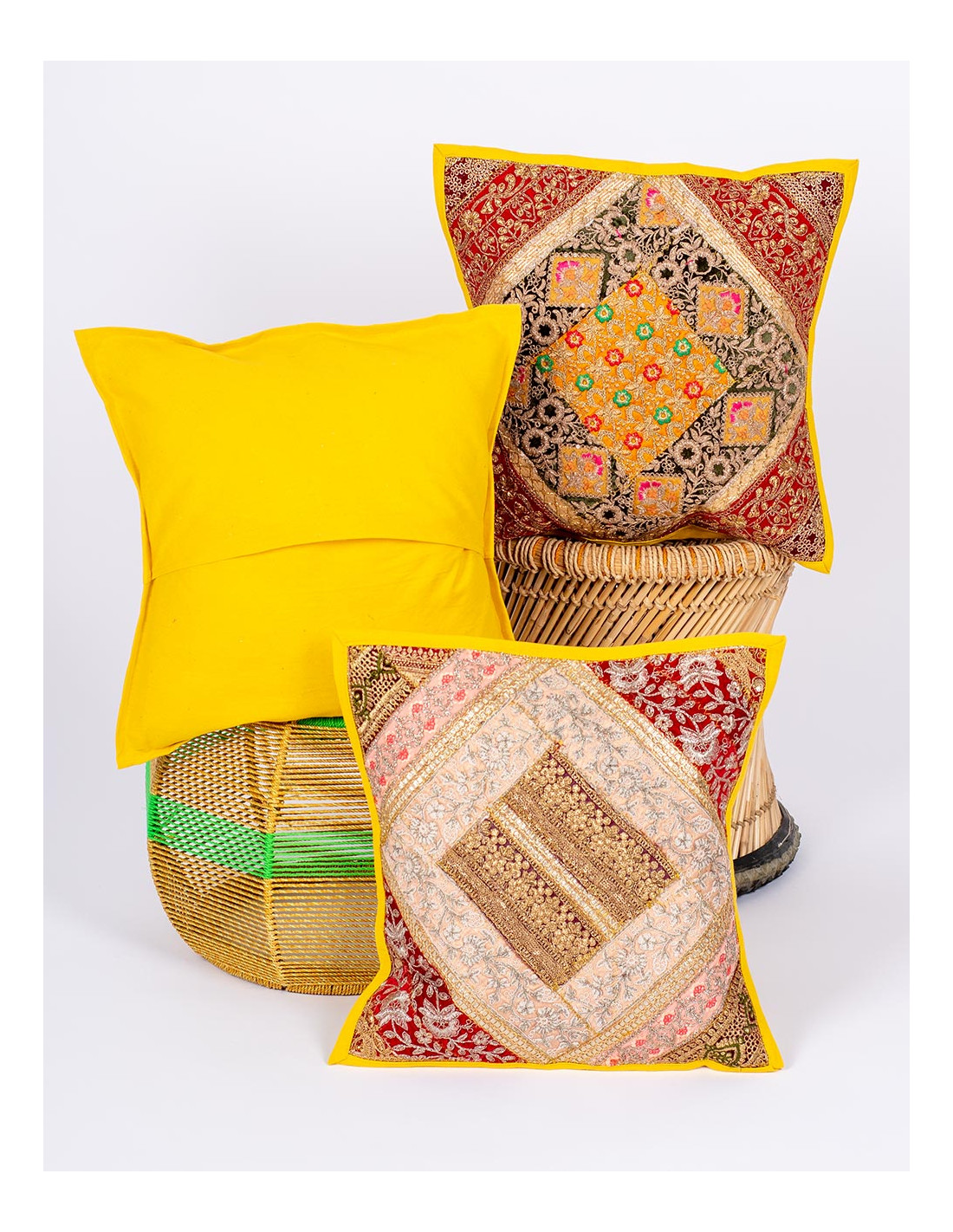 Funda de cojín 40x40 en algodón amarillo con bordados indios brillantes.