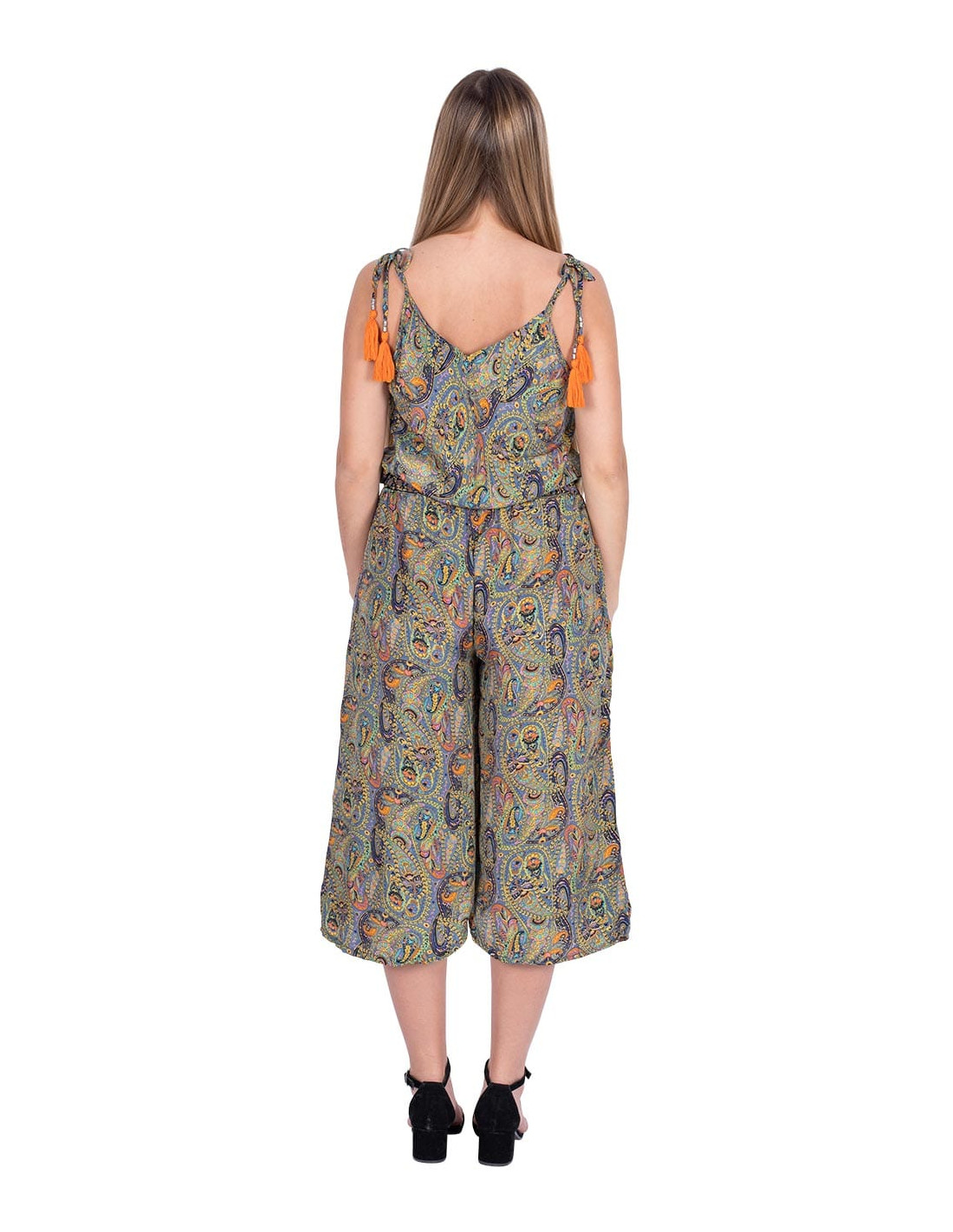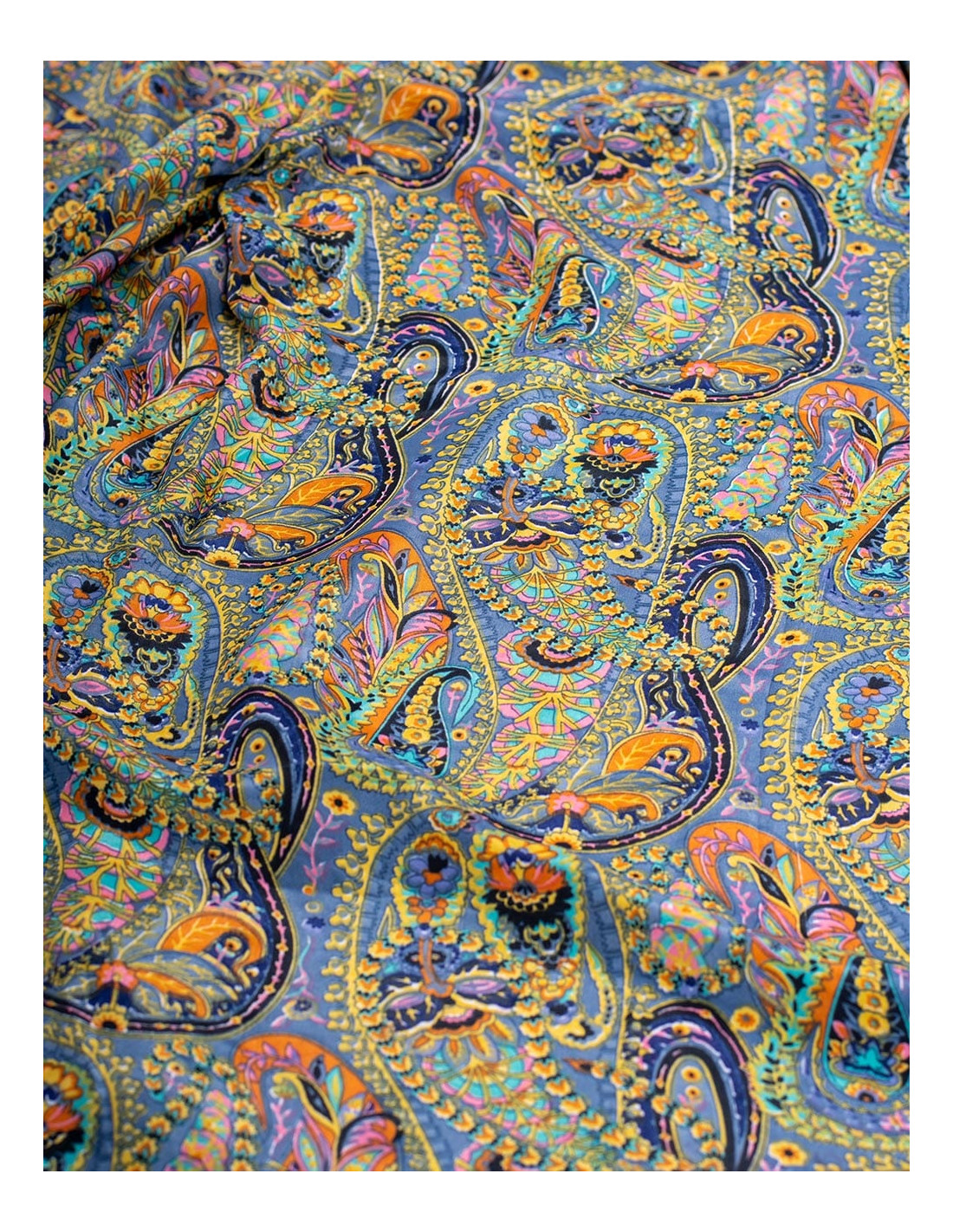 Blusa corta con mangas 3/4, fabricada en seda estampada con fondo rosa fuerte y dibujos en tonos naranjas y beige