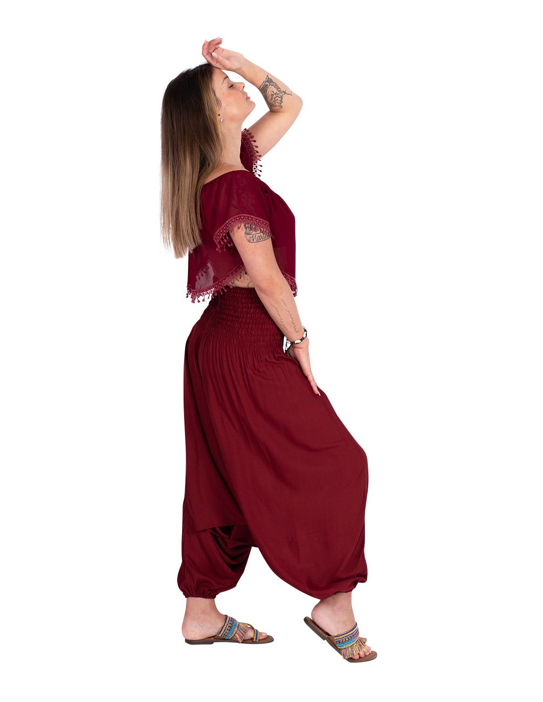 Top cropped con cuello estilo barco y volados. Su estampado tiene el color celeste como base con dibujos en azul y rojo