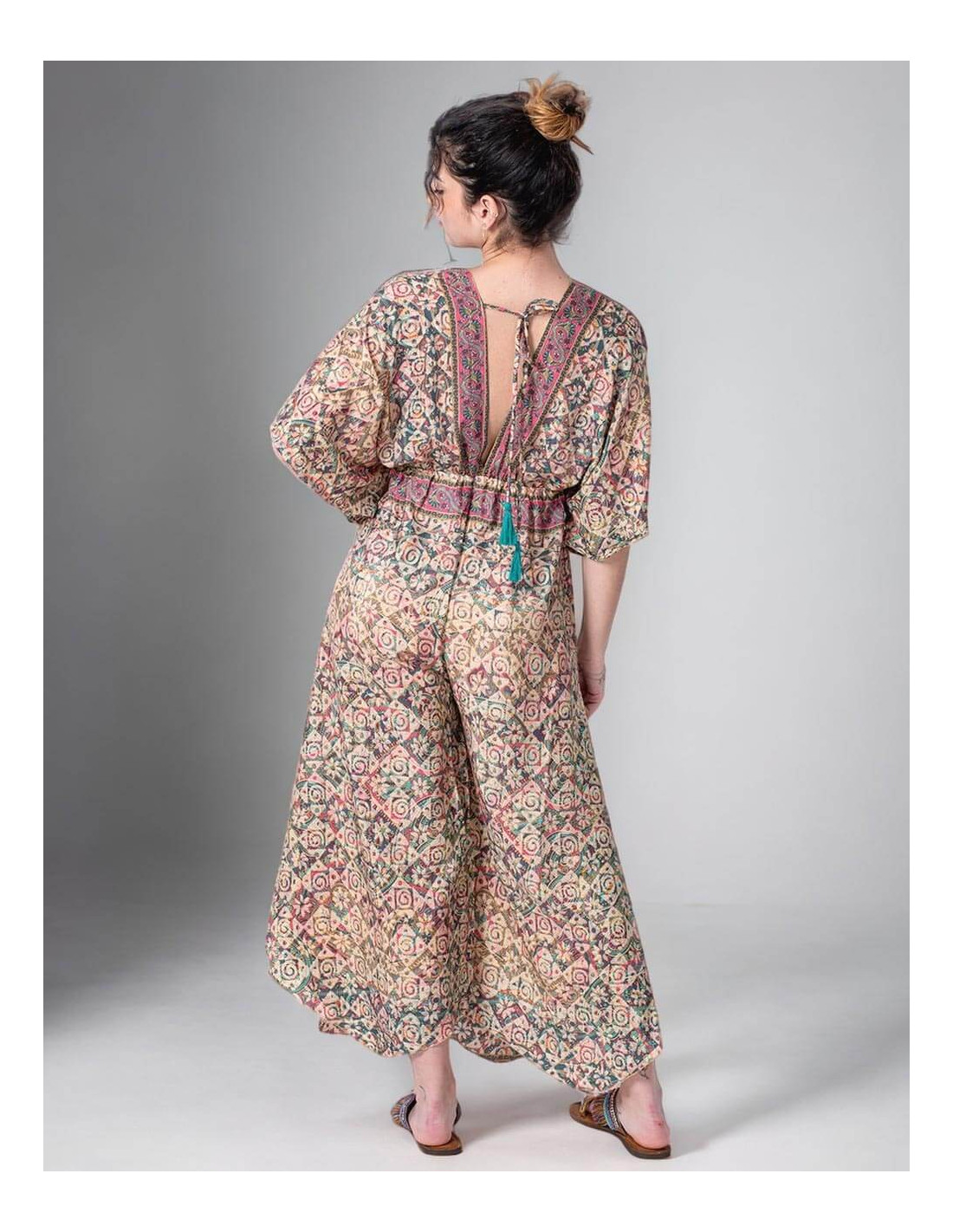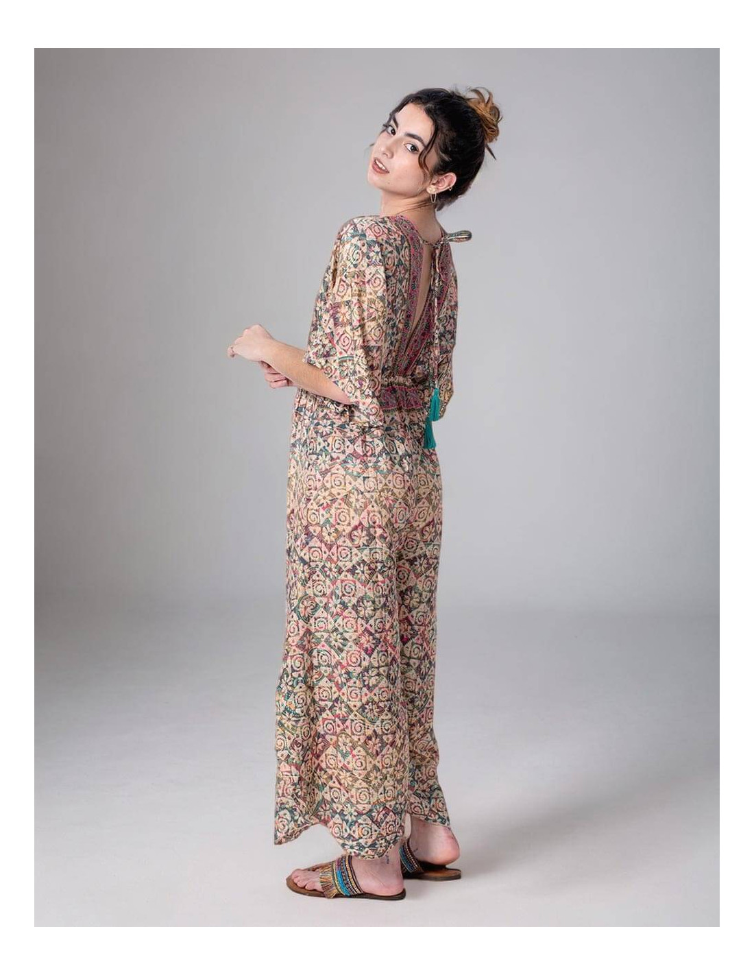 Vestido largo con tirantes anchos y volantes en la parte inferior. Su fondo es color verde claro y posee dibujos en tonos azules entre otros