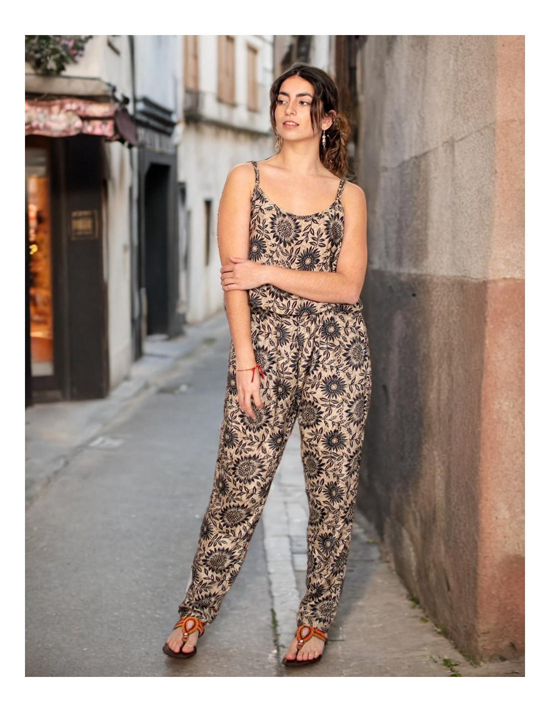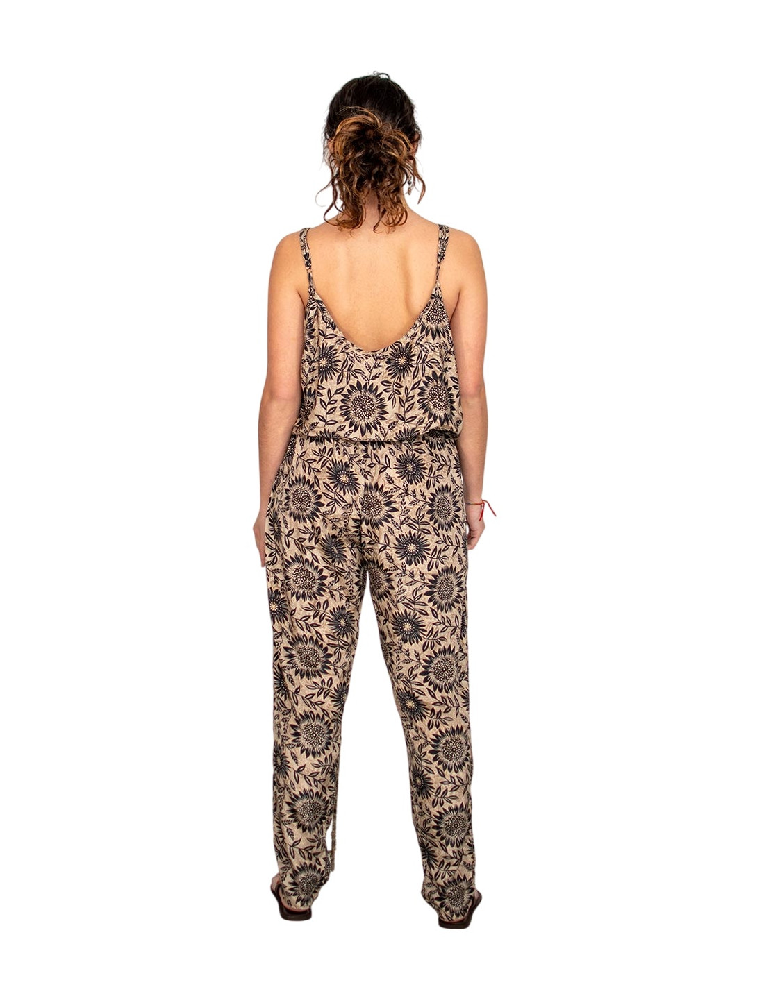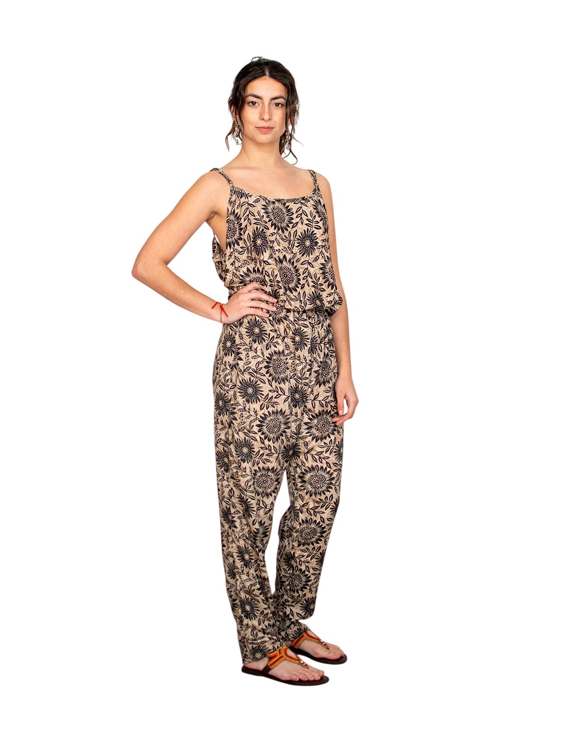 Este mono largo de Kimago es una pieza fluida y elegante, confeccionada en suave seda estampada en tonos ocres y marrones. El diseño suelto y fresco se adapta con naturalidad gracias a la goma en la cintura, aportando comodidad sin renunciar al estilo. Los tirantes regulables y el escote redondo —más pronunciado por detrás— realzan la silueta de forma sutil. Cuenta con prácticos bolsillos a los lados. Una prenda de moda étnica con inspiración india que transmite autenticidad, ideal para tiendas que valoran la artesanía textil y el diseño cultural con alma.