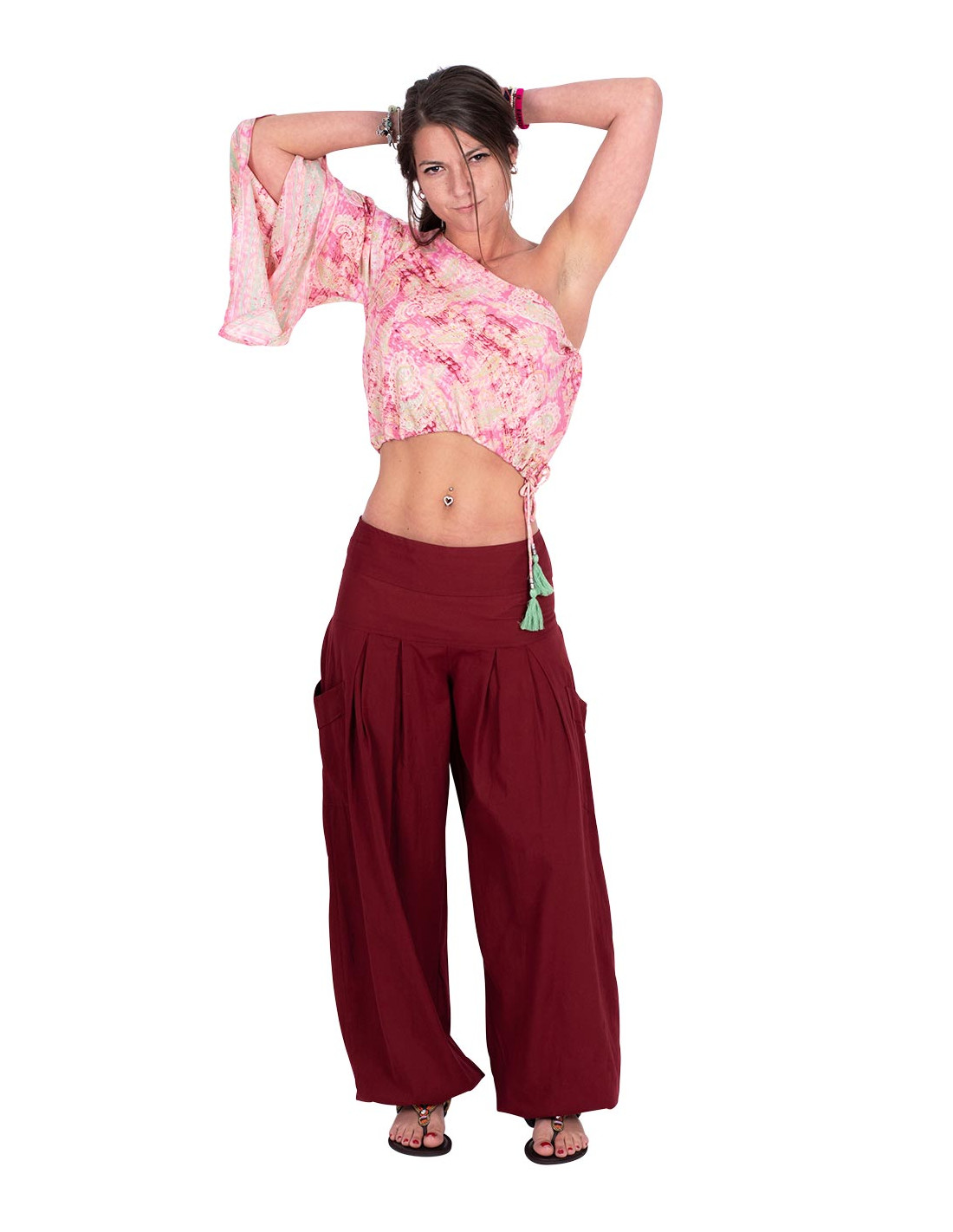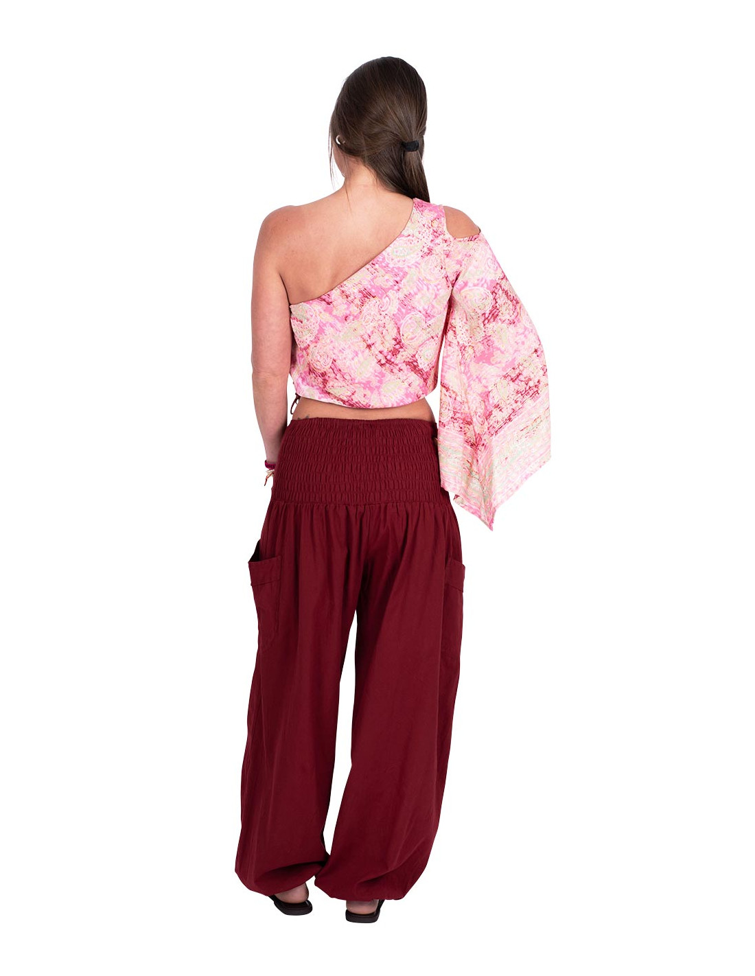 Uno de los hombros esta totalmente al descubierto, mientras que el otro posee un agujeros donde tambien puede verse, pero luego posee una manga larga y amplia.