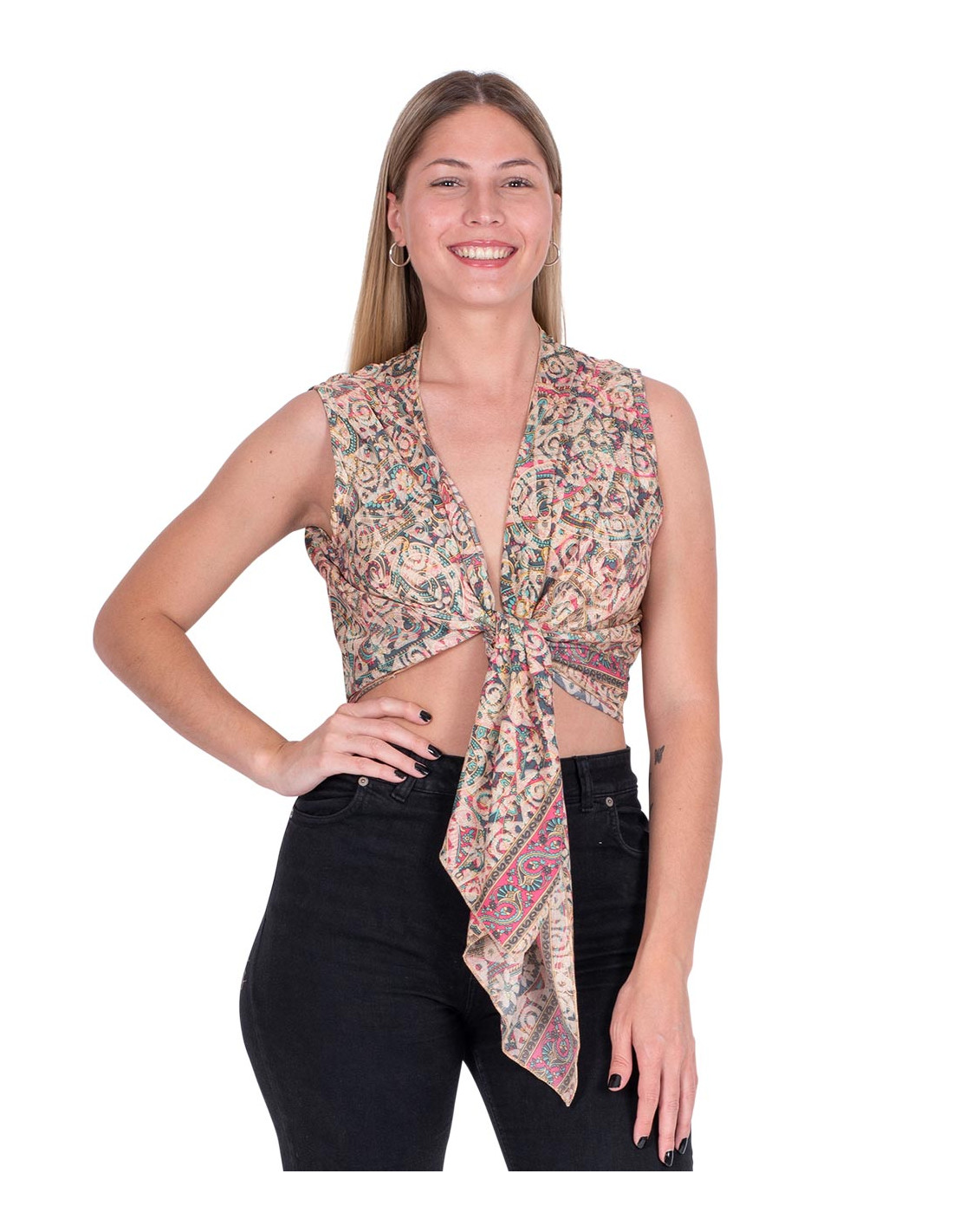 Mono largo de seda estampada Kimago en tonos tierra. Tirantes ajustables, escote redondo, goma en la cintura y bolsillos laterales. Elegancia artesanal india.