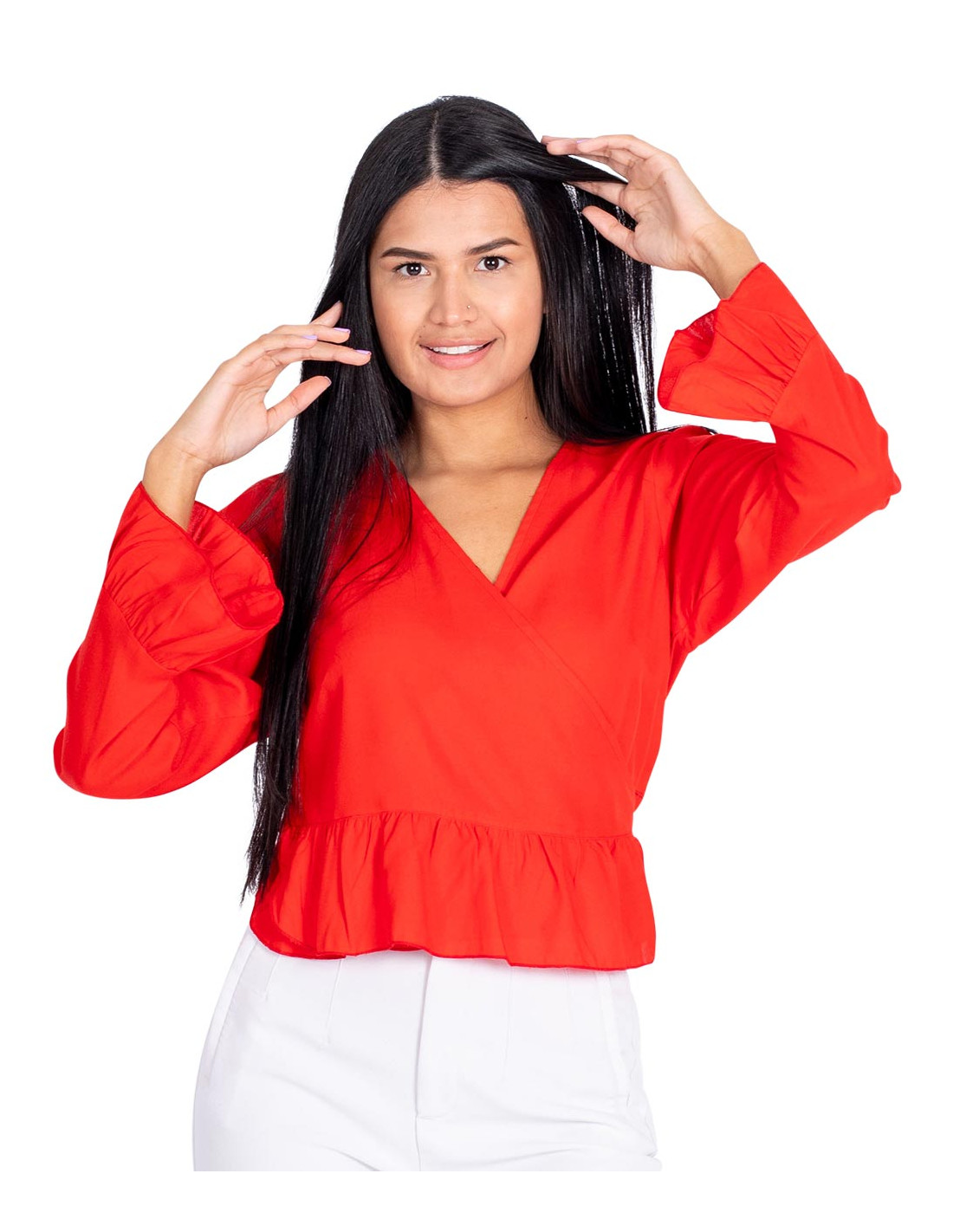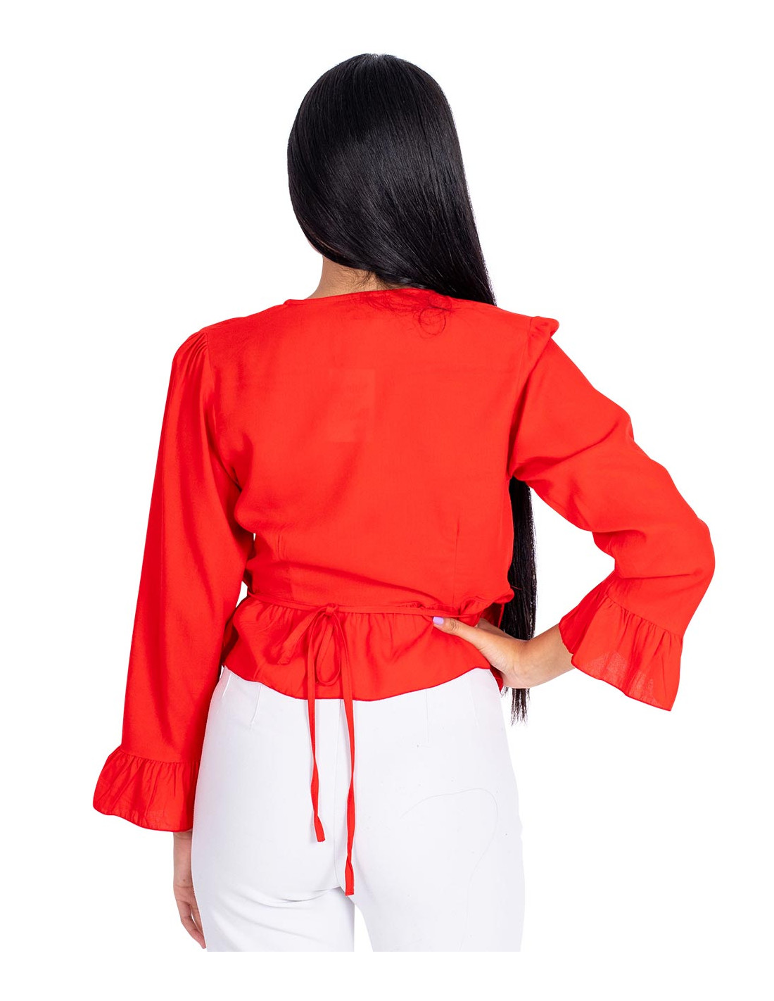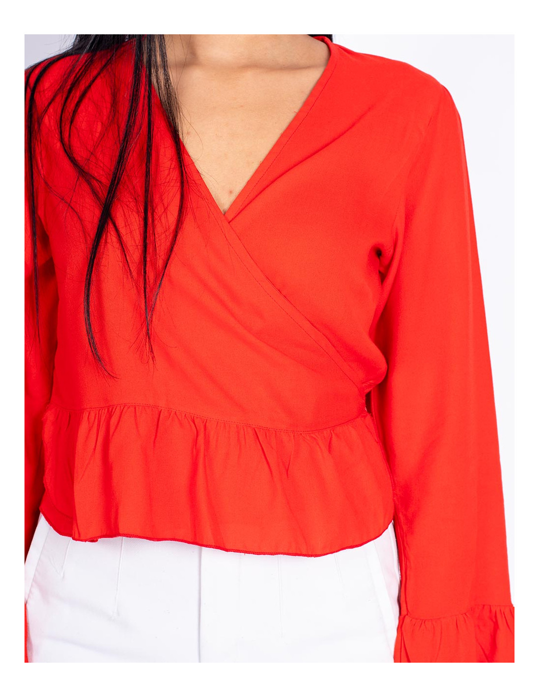 Blusa corta con mangas largas fabricada en rayón de color azul