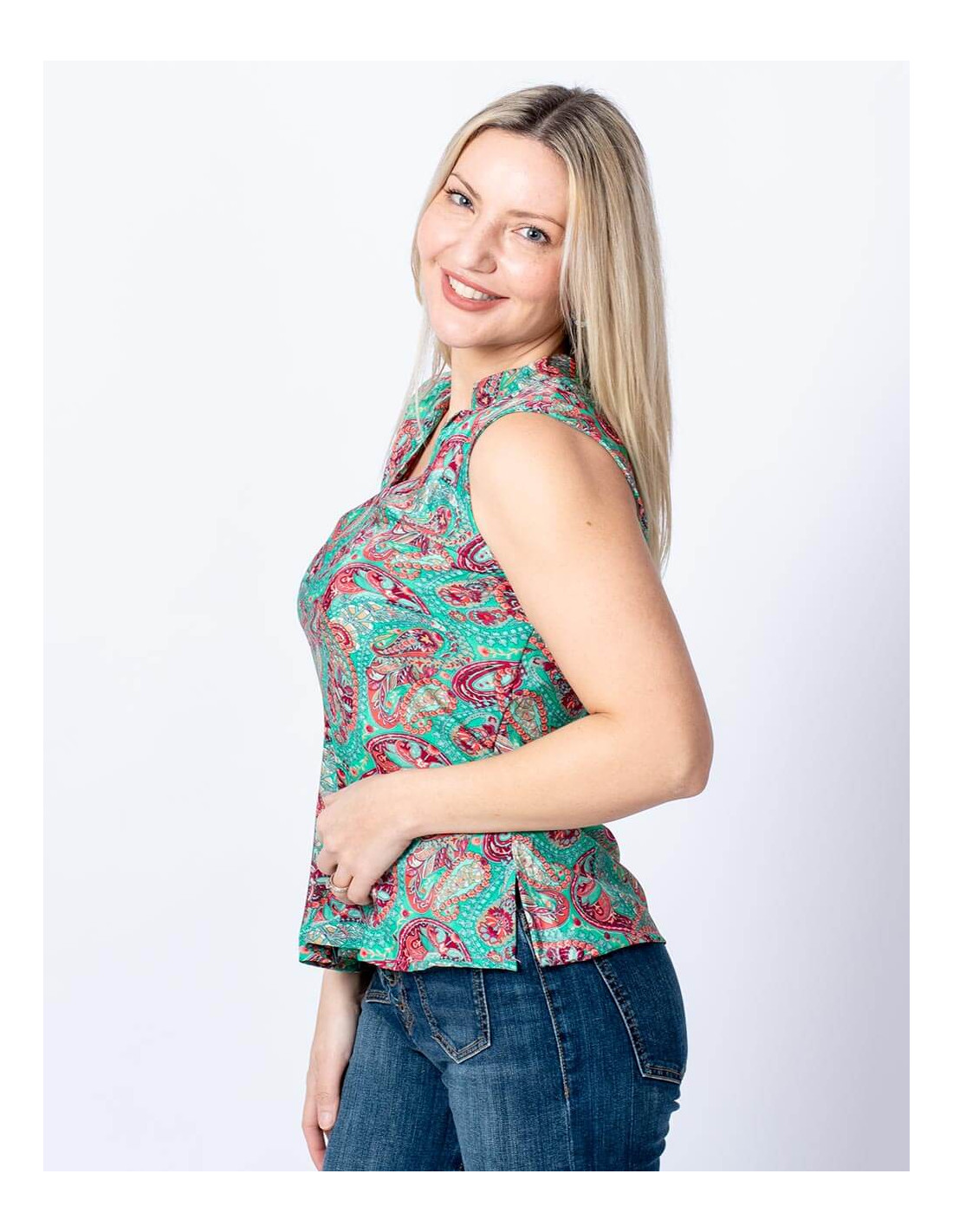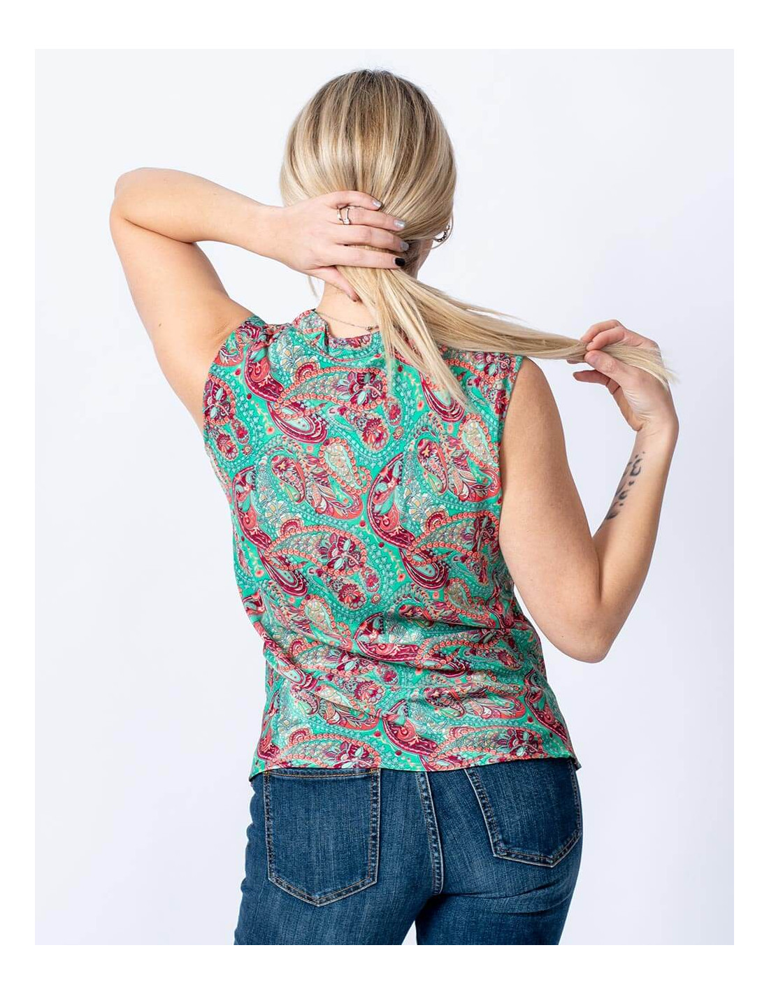 Blusa de seda con mangas pequeñas y escote en pico estampada en la gama del azul