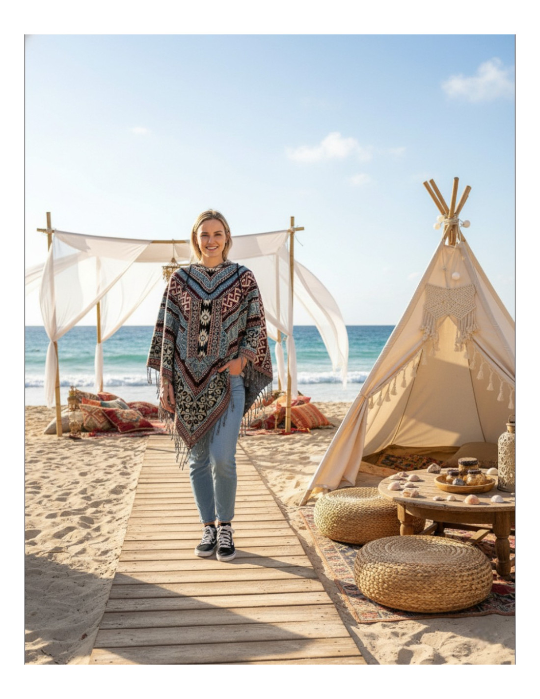 El poncho étnico unisex de Kimago fusiona la autenticidad de la artesanía india con la comodidad moderna.