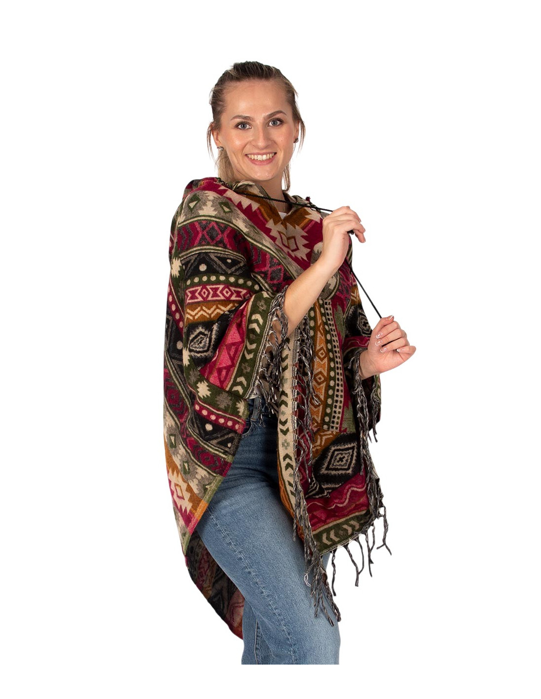 Poncho unisex de estilo étnico con capucha, flecos y bolsillos.