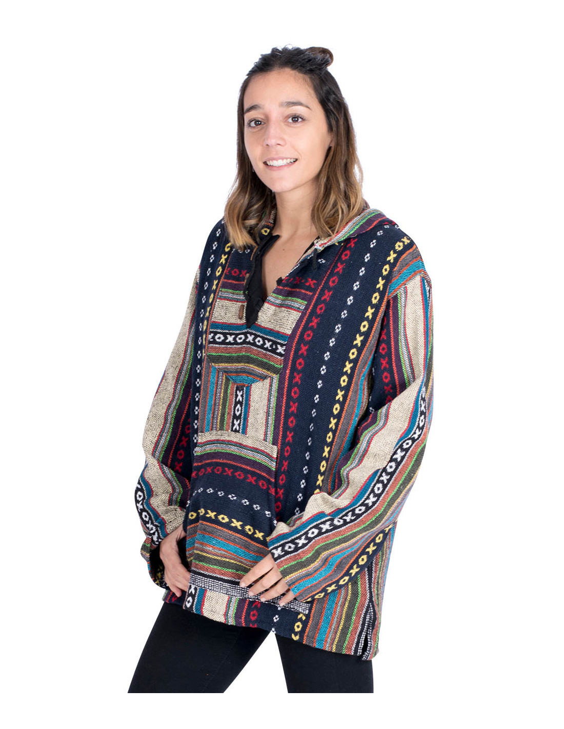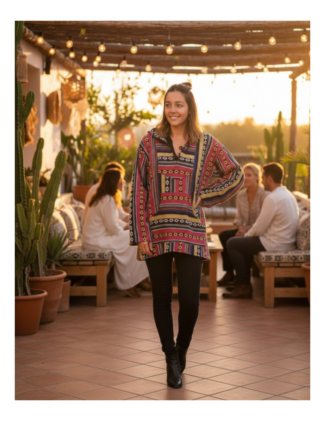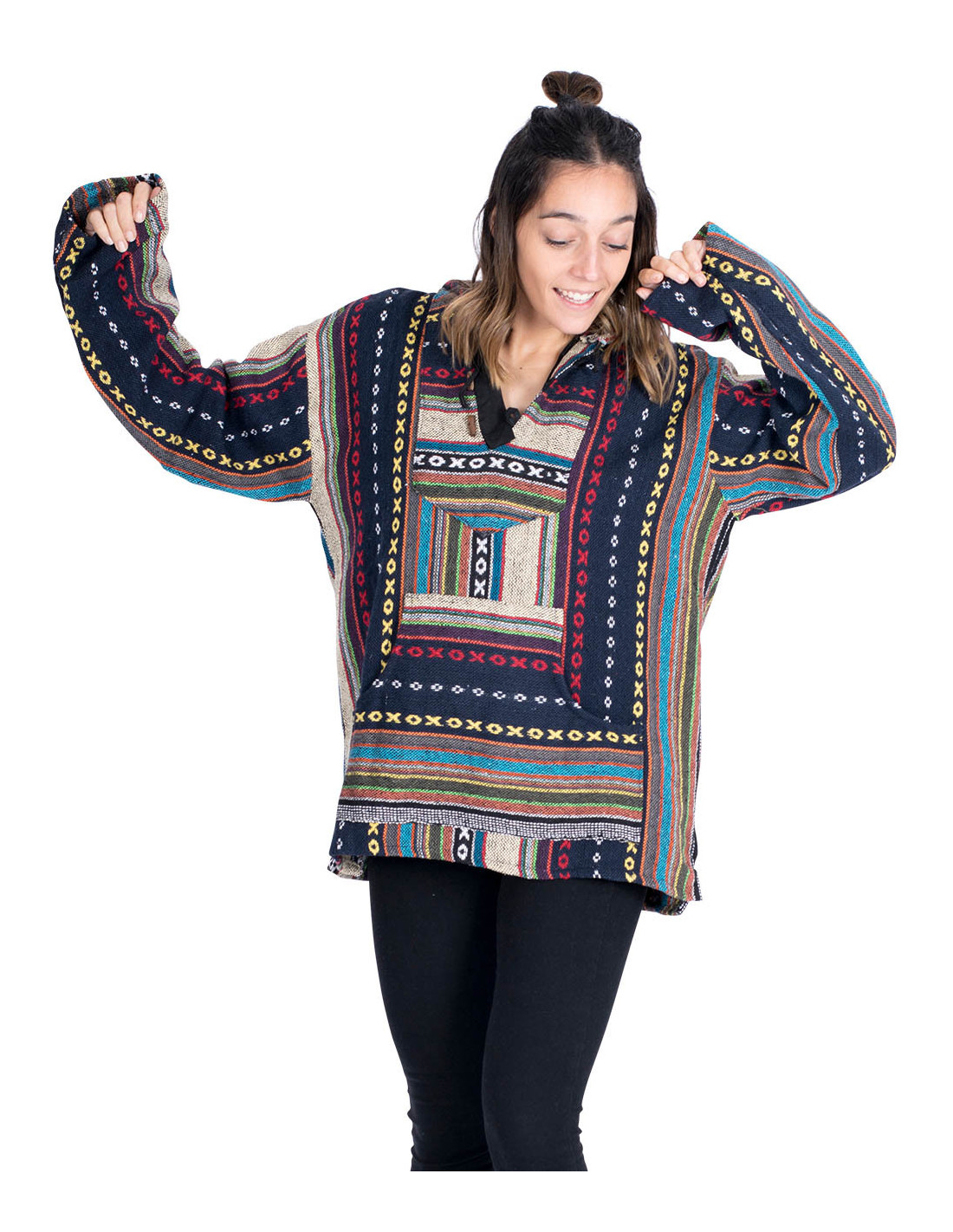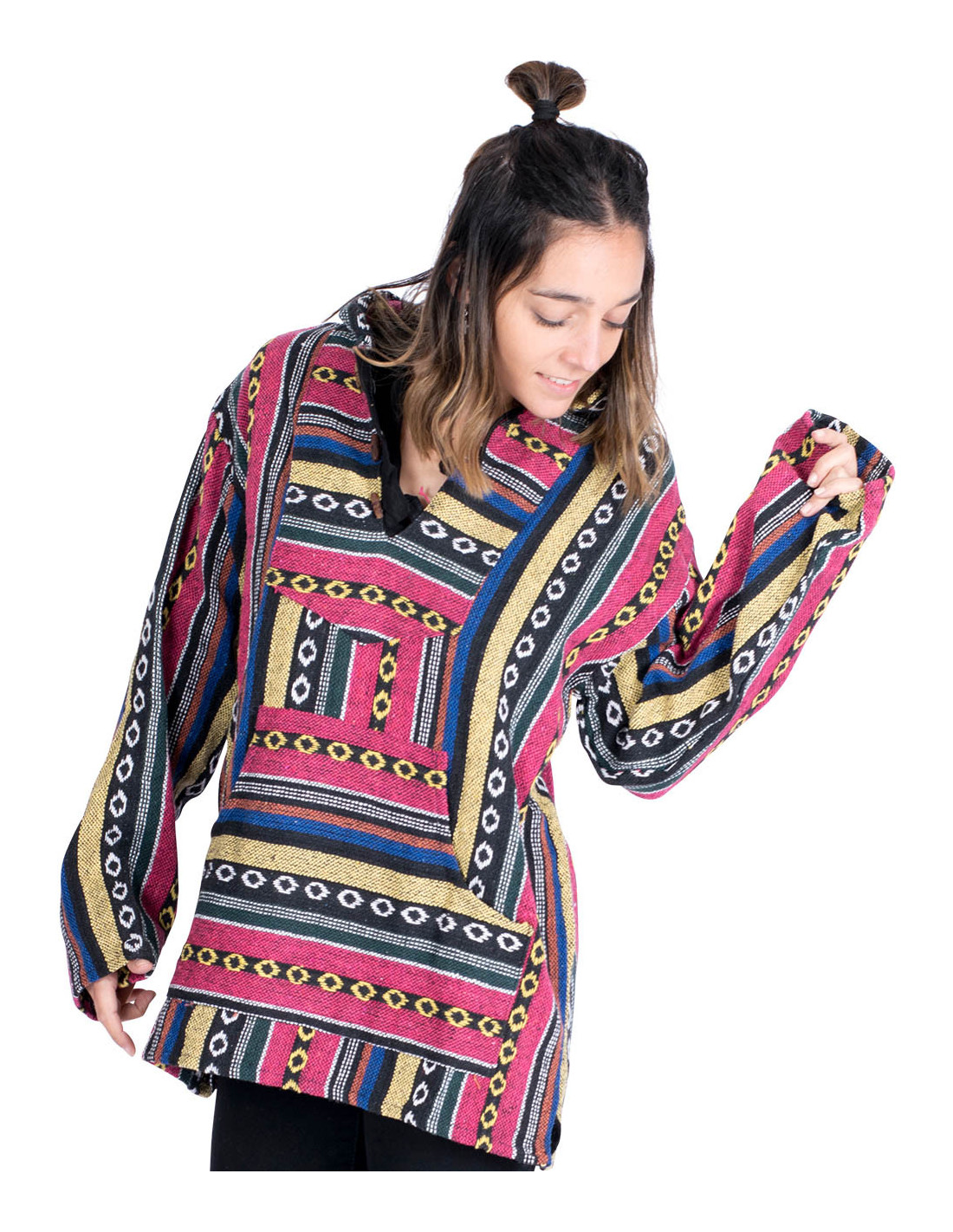 Elaborada en algodón 100%, destaca por sus estampados y combinaciones cromáticas inspiradas en la cultura india, aplicados en patrones variados que hacen que cada pieza sea única. Incluye capucha integrada y bolsillo delantero tipo canguro, ofreciendo comodidad y un aire informal muy valorado en la moda bohemia y alternativa.