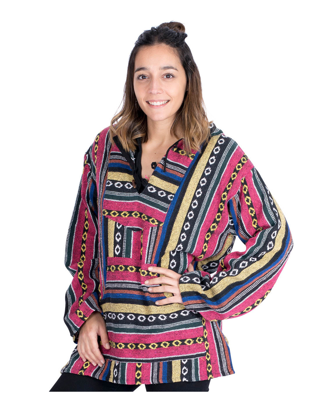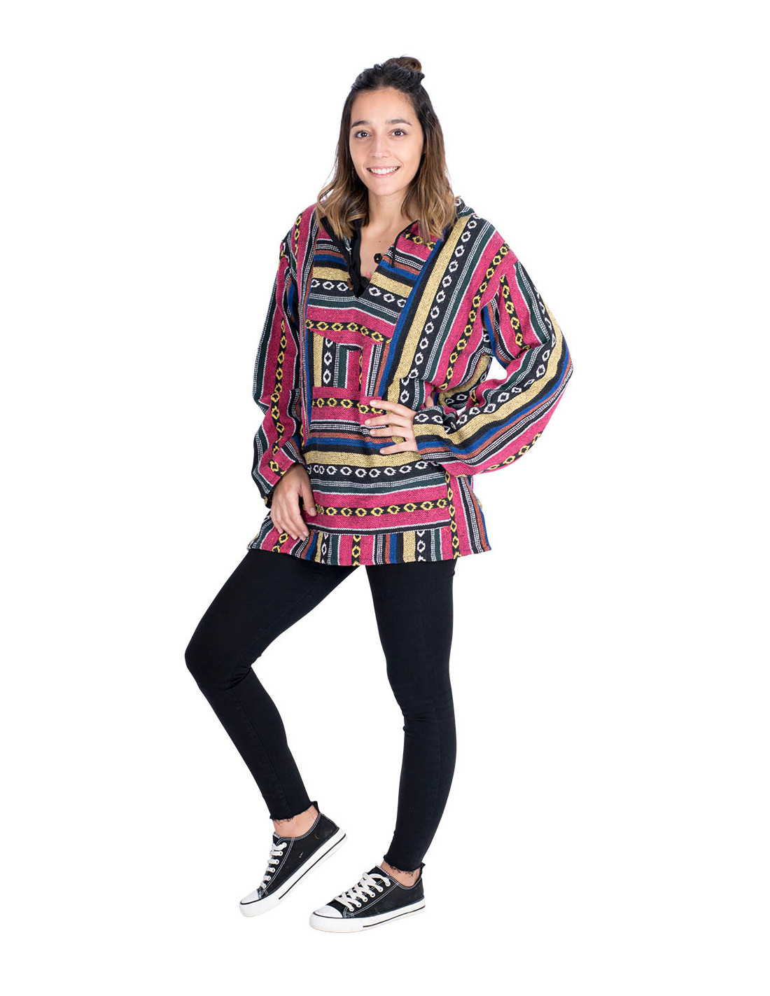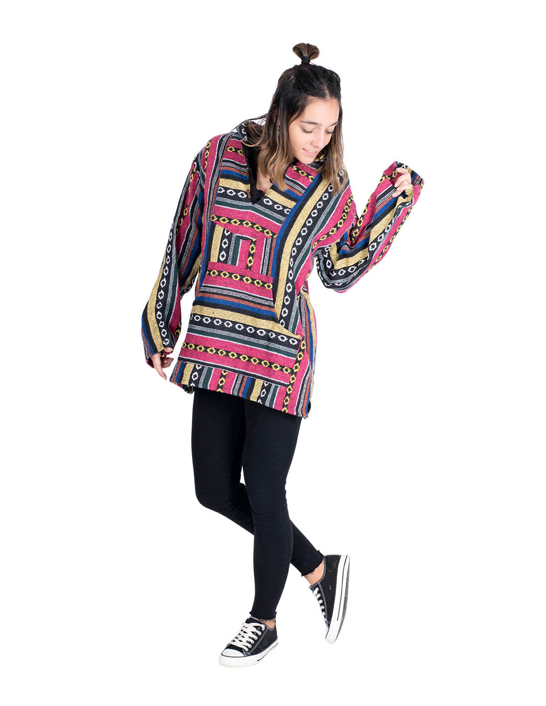 Elaborada en algodón 100%, destaca por sus estampados y combinaciones cromáticas inspiradas en la cultura india, aplicados en patrones variados que hacen que cada pieza sea única. Incluye capucha integrada y bolsillo delantero tipo canguro, ofreciendo comodidad y un aire informal muy valorado en la moda bohemia y alternativa.