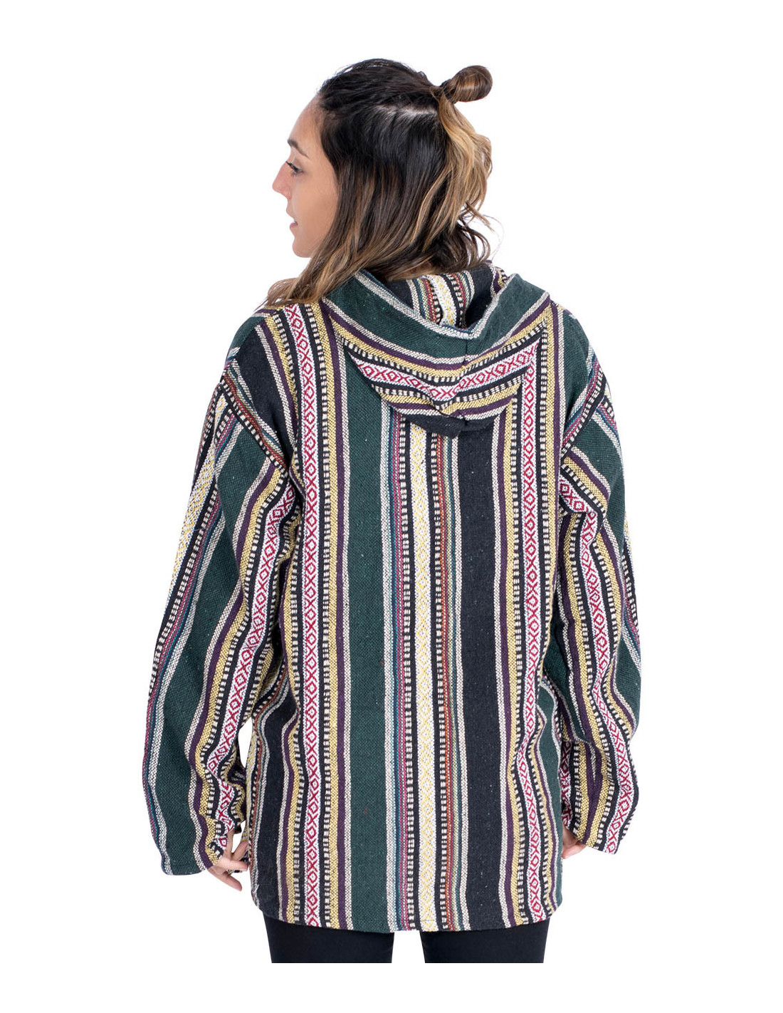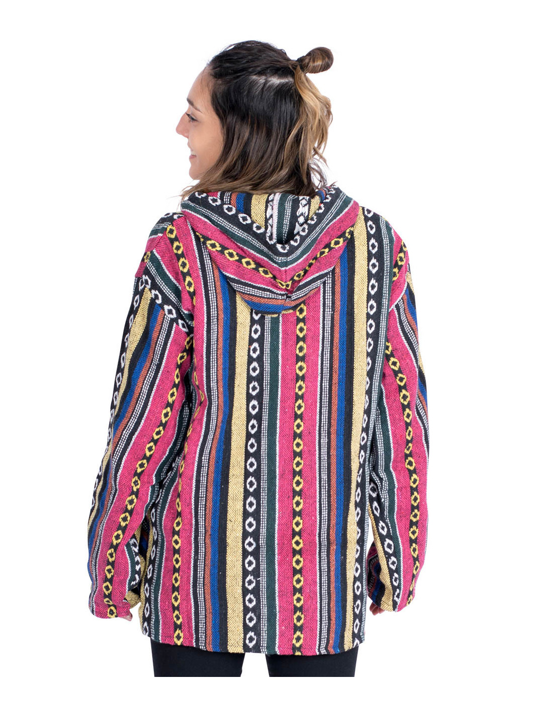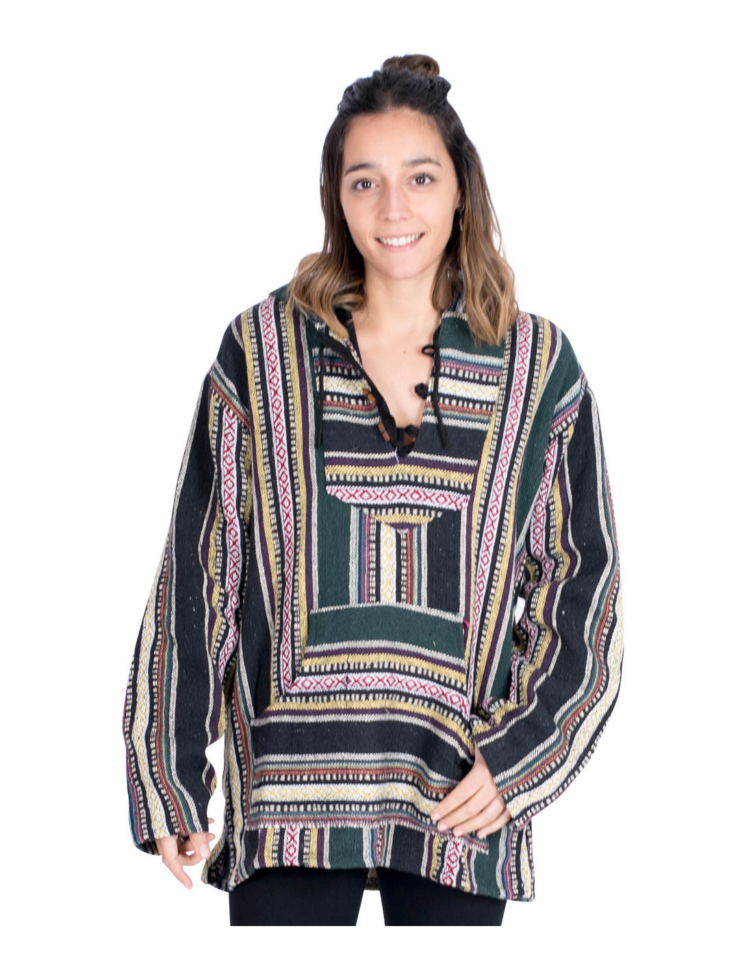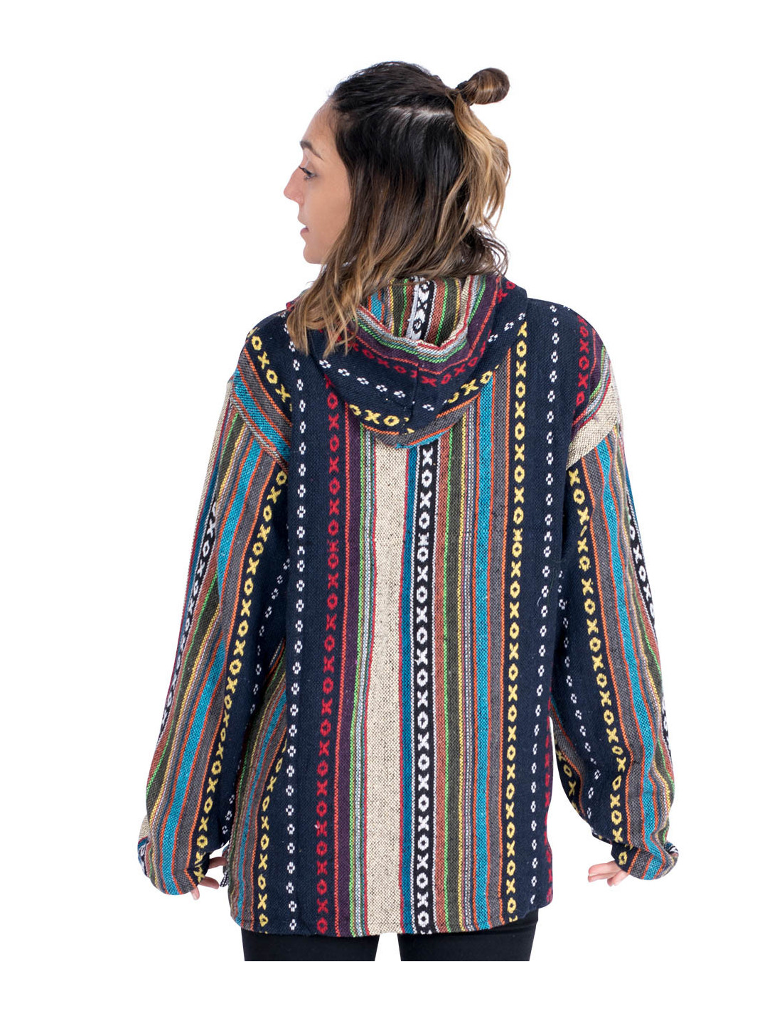 Elaborada en algodón 100%, destaca por sus estampados y combinaciones cromáticas inspiradas en la cultura india, aplicados en patrones variados que hacen que cada pieza sea única. Incluye capucha integrada y bolsillo delantero tipo canguro, ofreciendo comodidad y un aire informal muy valorado en la moda bohemia y alternativa.