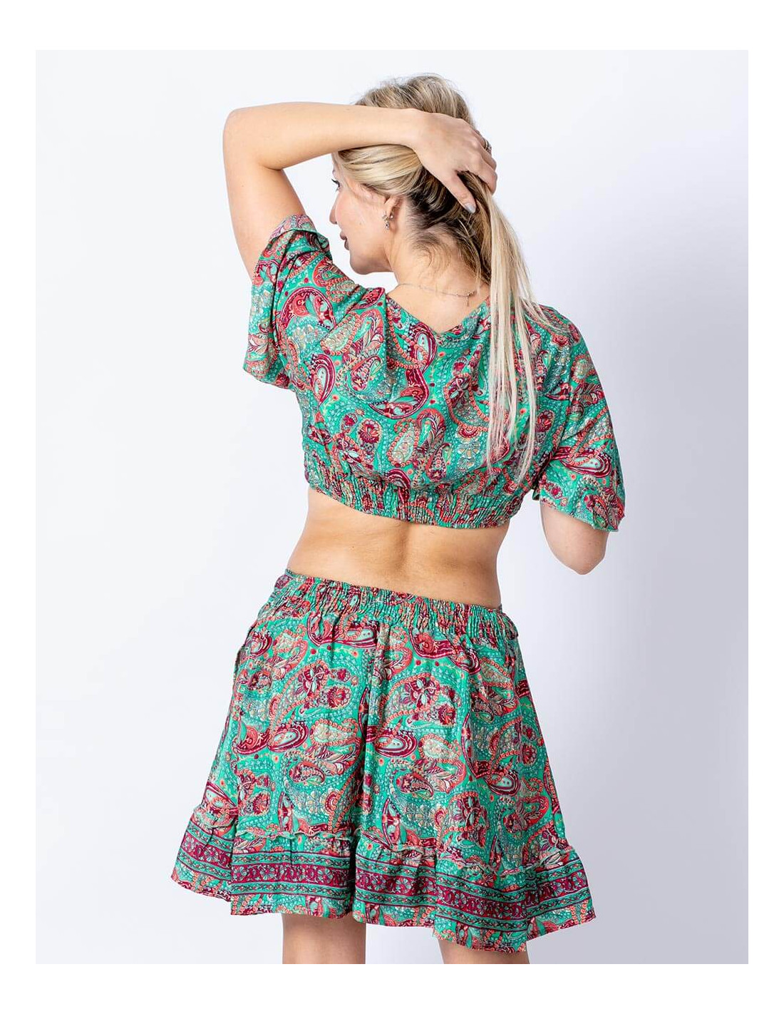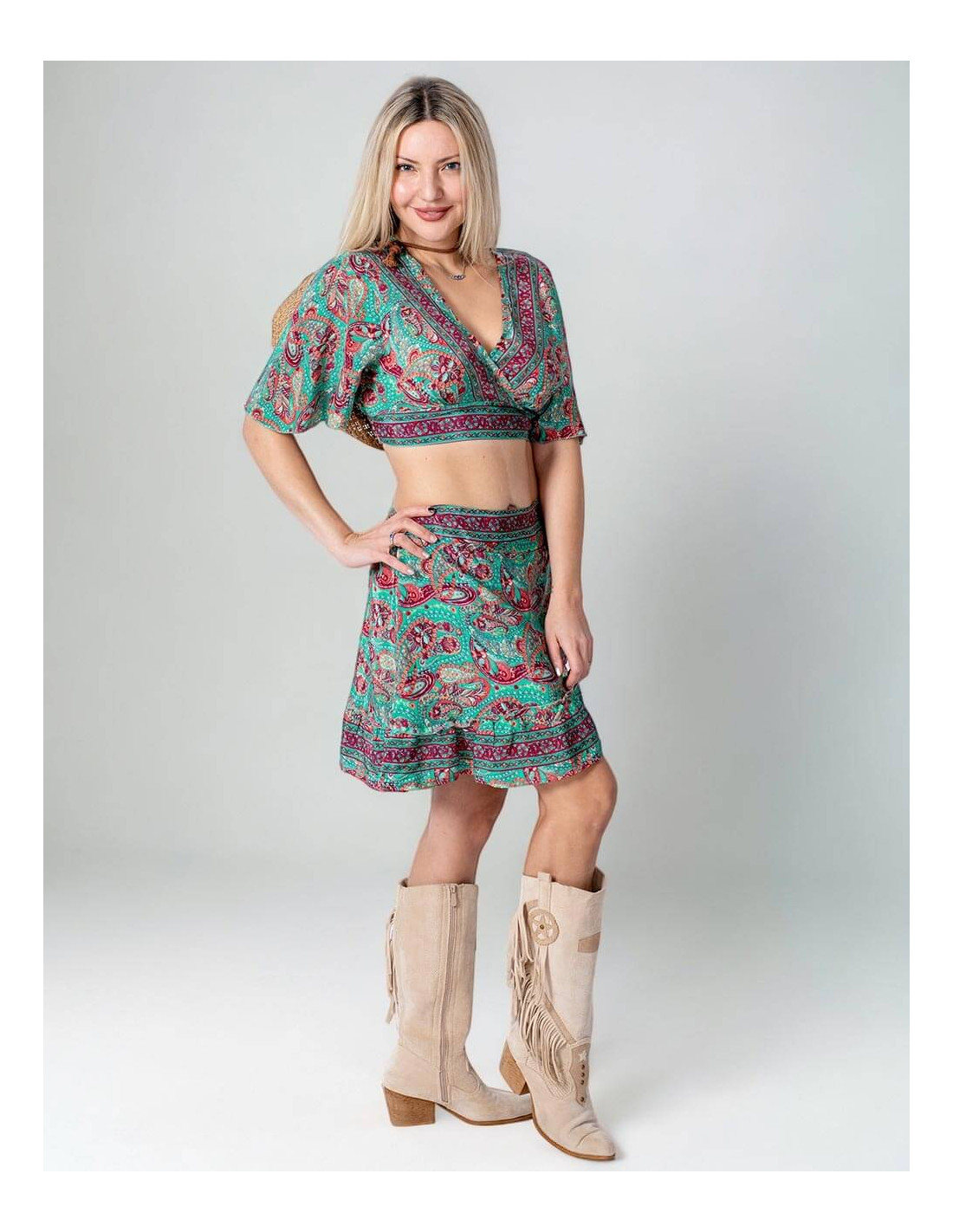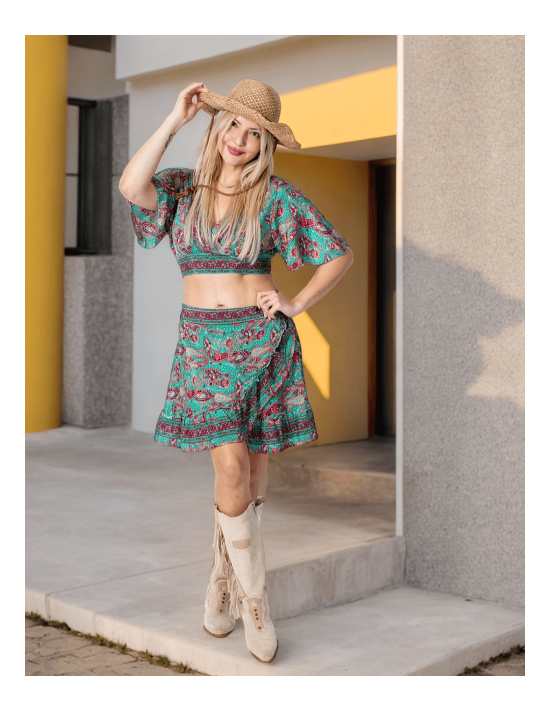 Vestido largo de Kimago en seda y poliéster, con escote en pico, tirantes regulables y goma en la espalda. Estilo étnico elegante y cómodo.