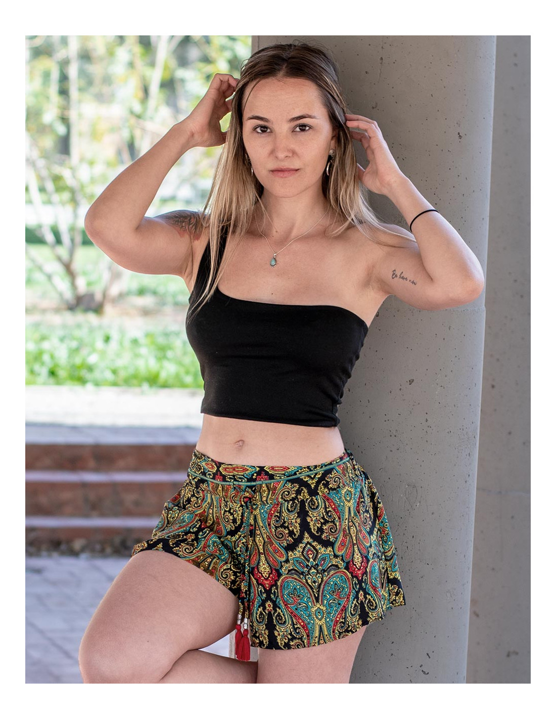 Falda fabricada en seda, larga y abotonada. Estampada con fondo morado y dibujos en rosa