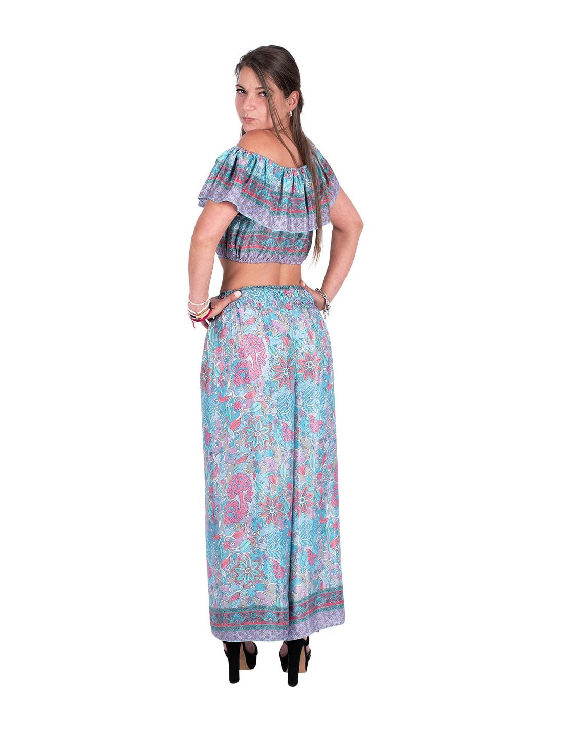 Pantalón recto y fino fabricado en seda con dibujos paisley en color azul con dibujos de flores en varios colores