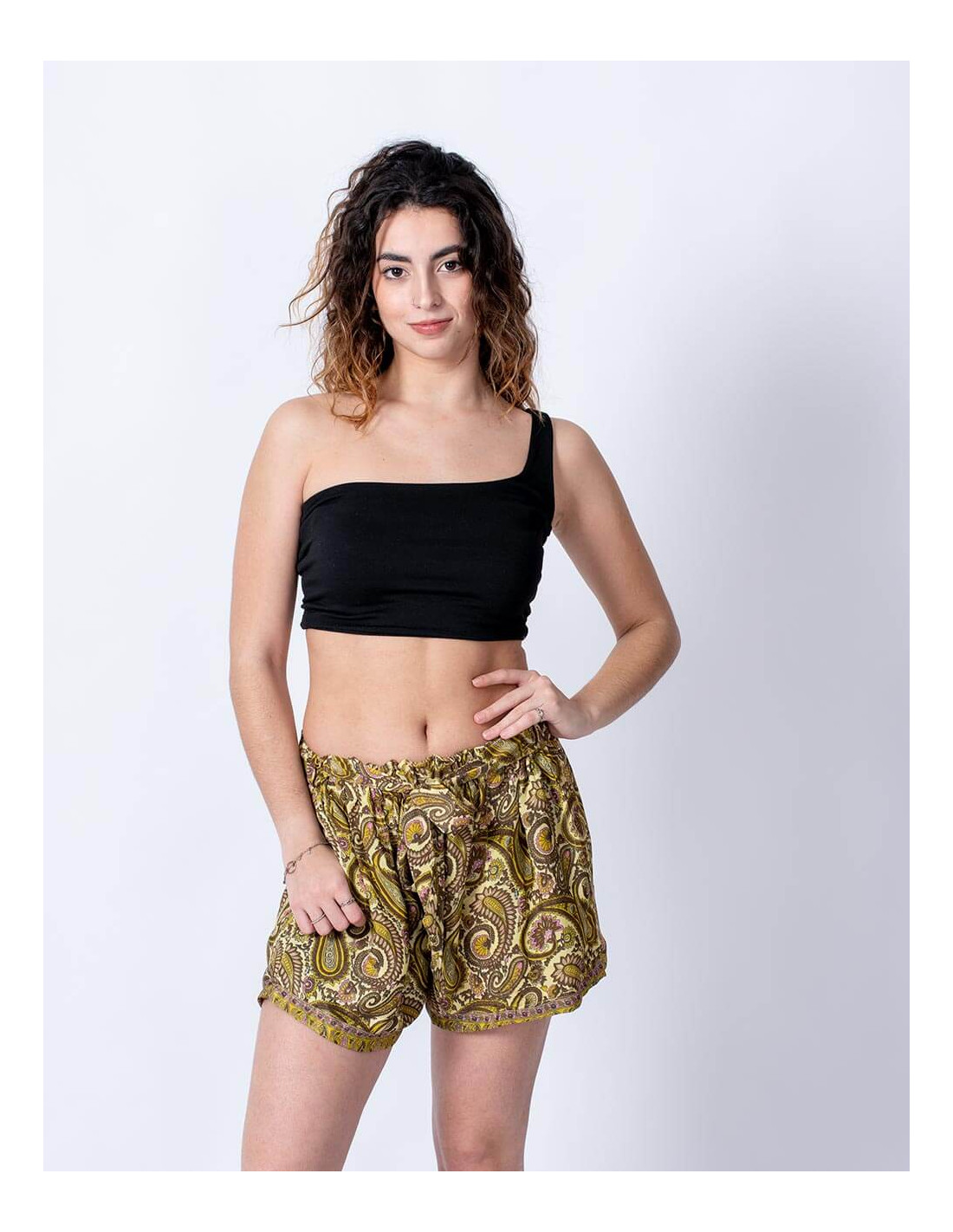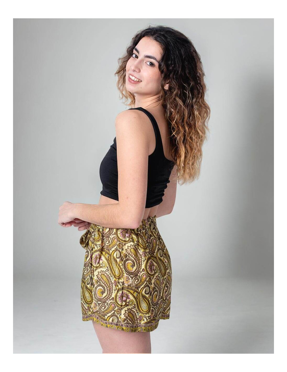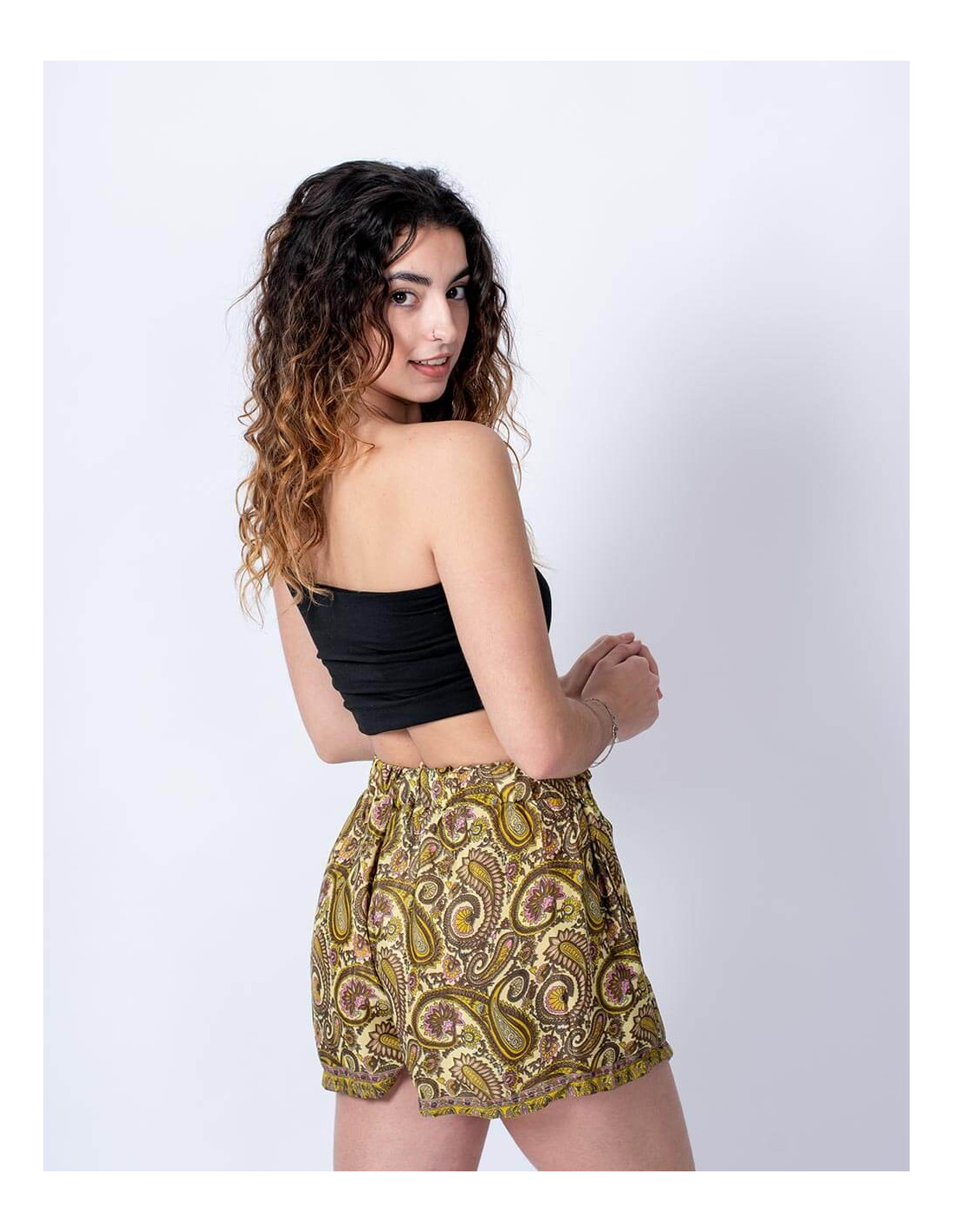 Vestido extra corto y suelto con escote en pico y espalda descubierta. Estampado en color rosa con detalles en verde