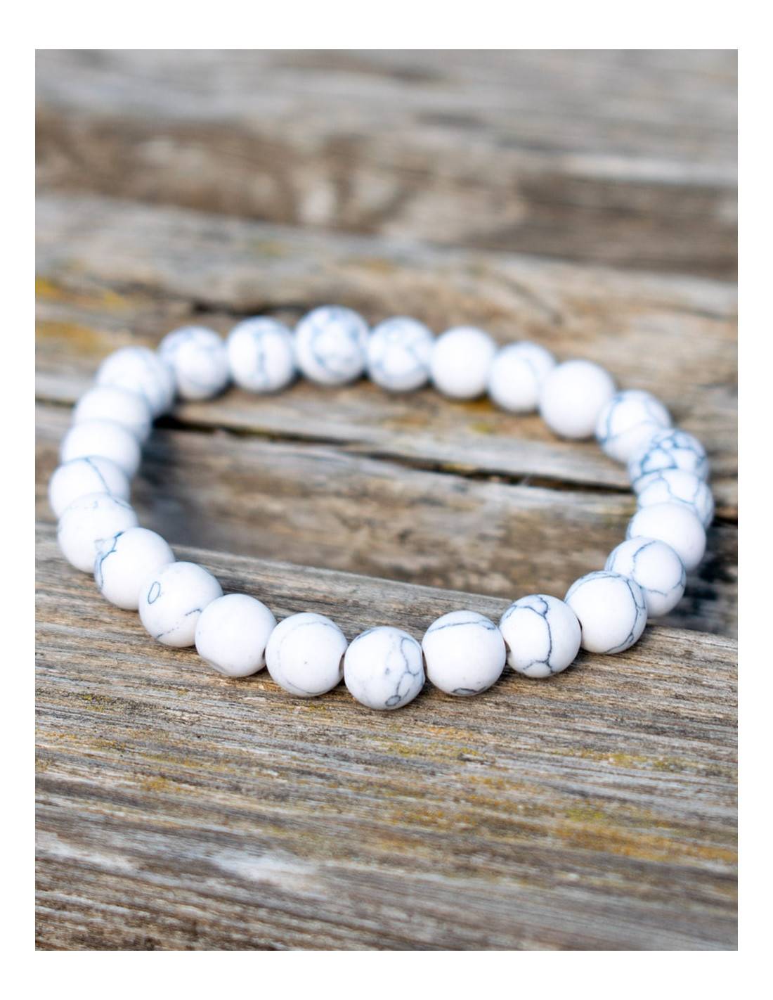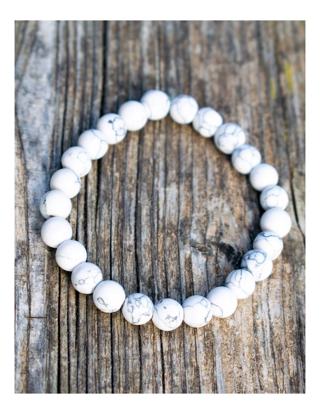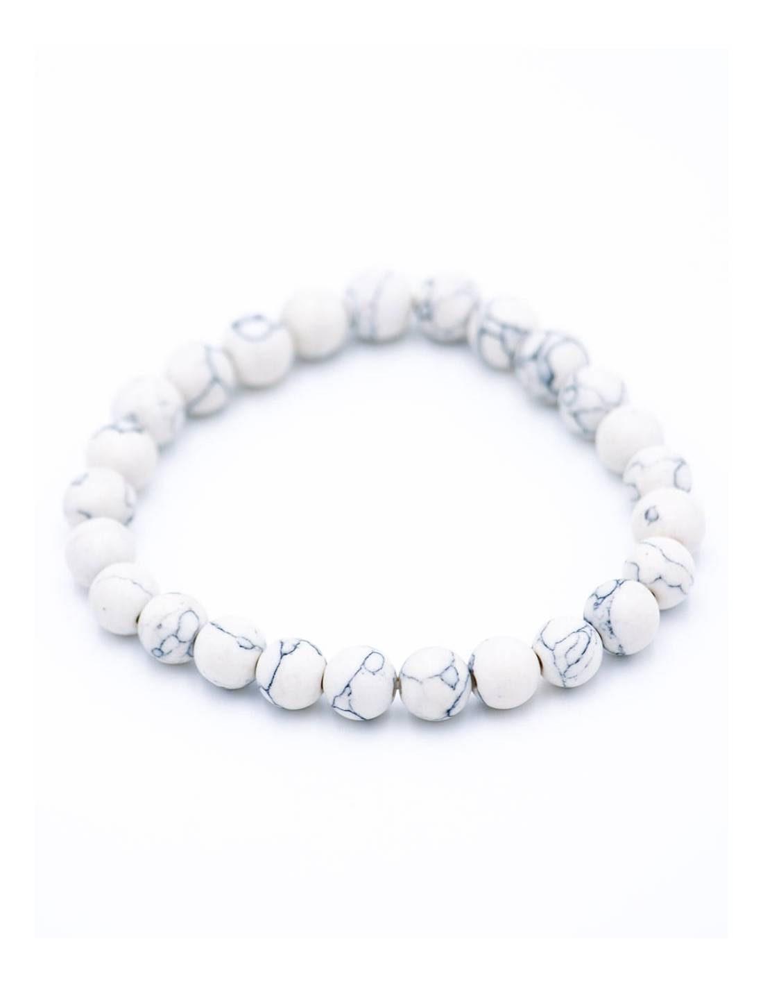 Pulsera fabricada en forma artesanal con bolitas de 8 mm de la piedra mineral Howlita, la que formenta la paciencia y la buena comunicacion