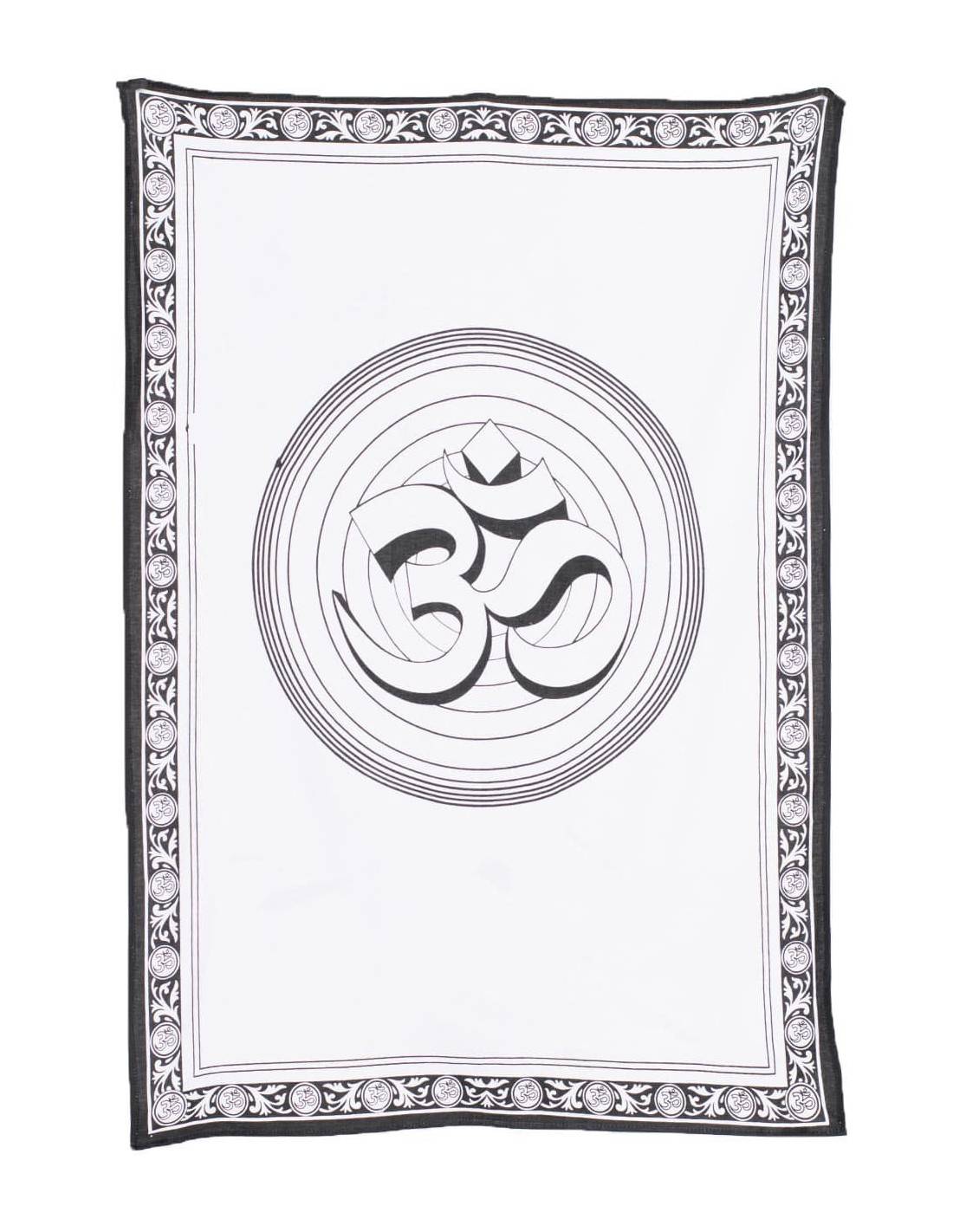 Tapiz confeccionado en algodón en color blanco y negro con la imagen de los 7 chakras indicados en el cuerpo humano