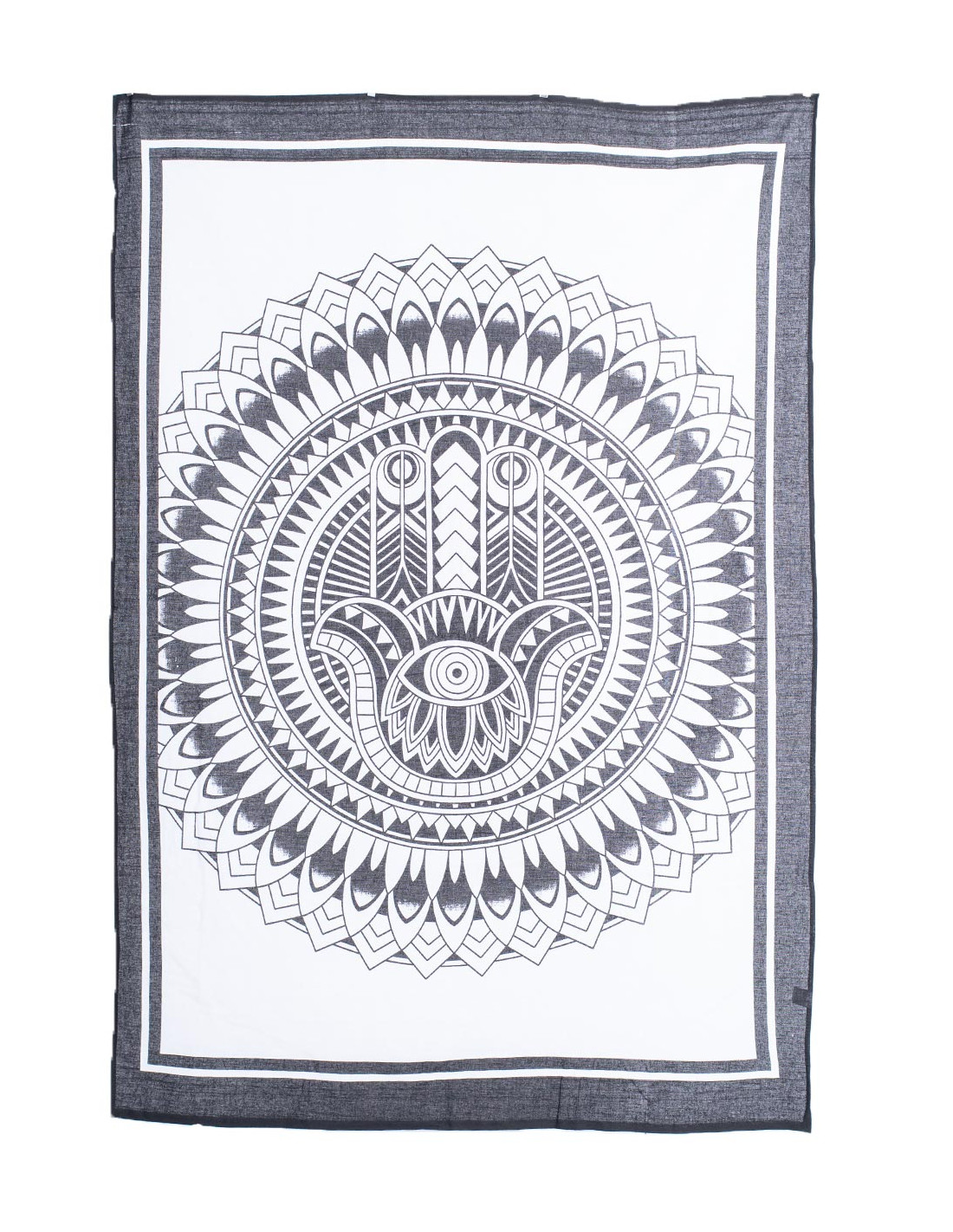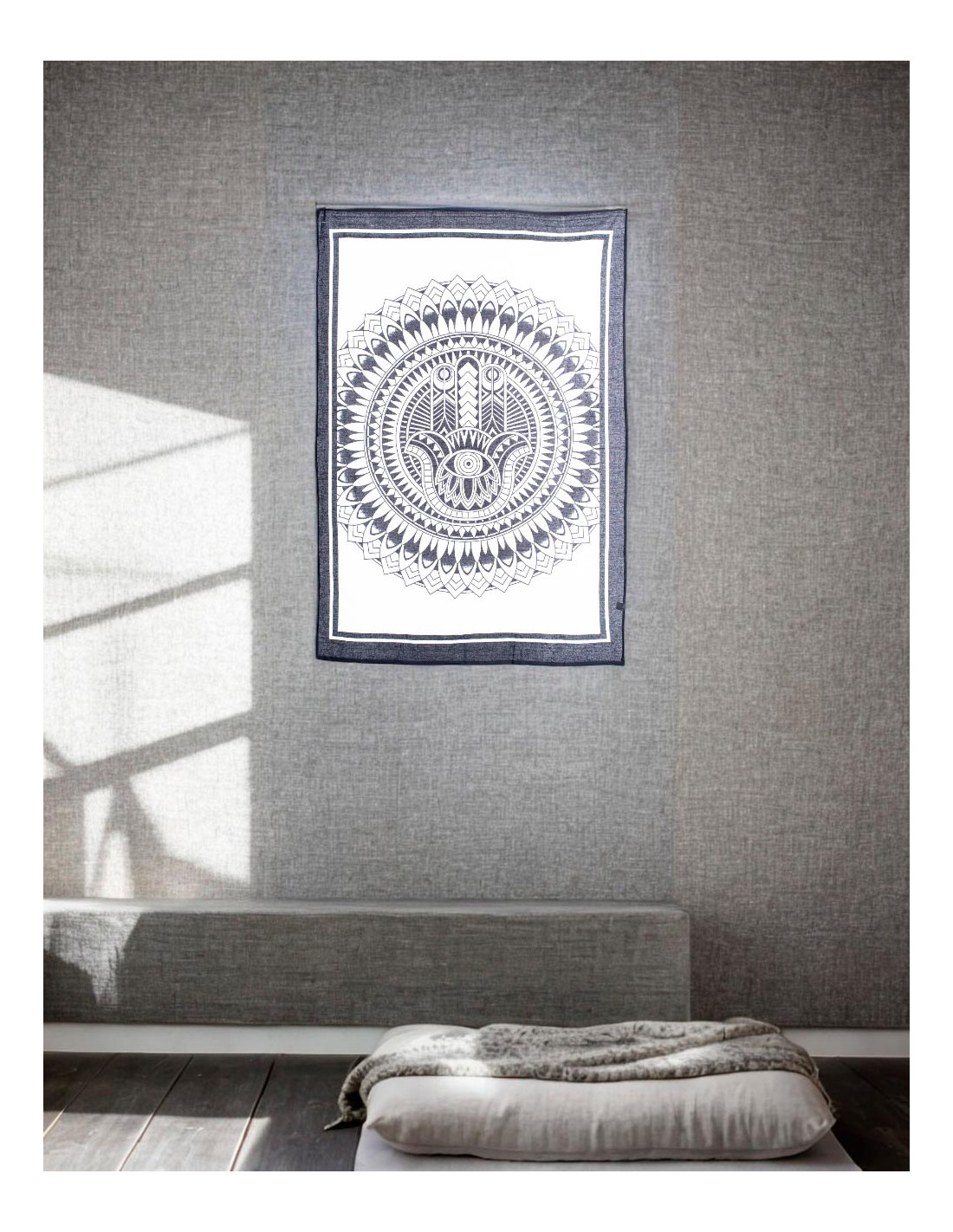 Tapiz étnico de algodón en color blanco y negro con el dibujo de la mano de Hamsa
