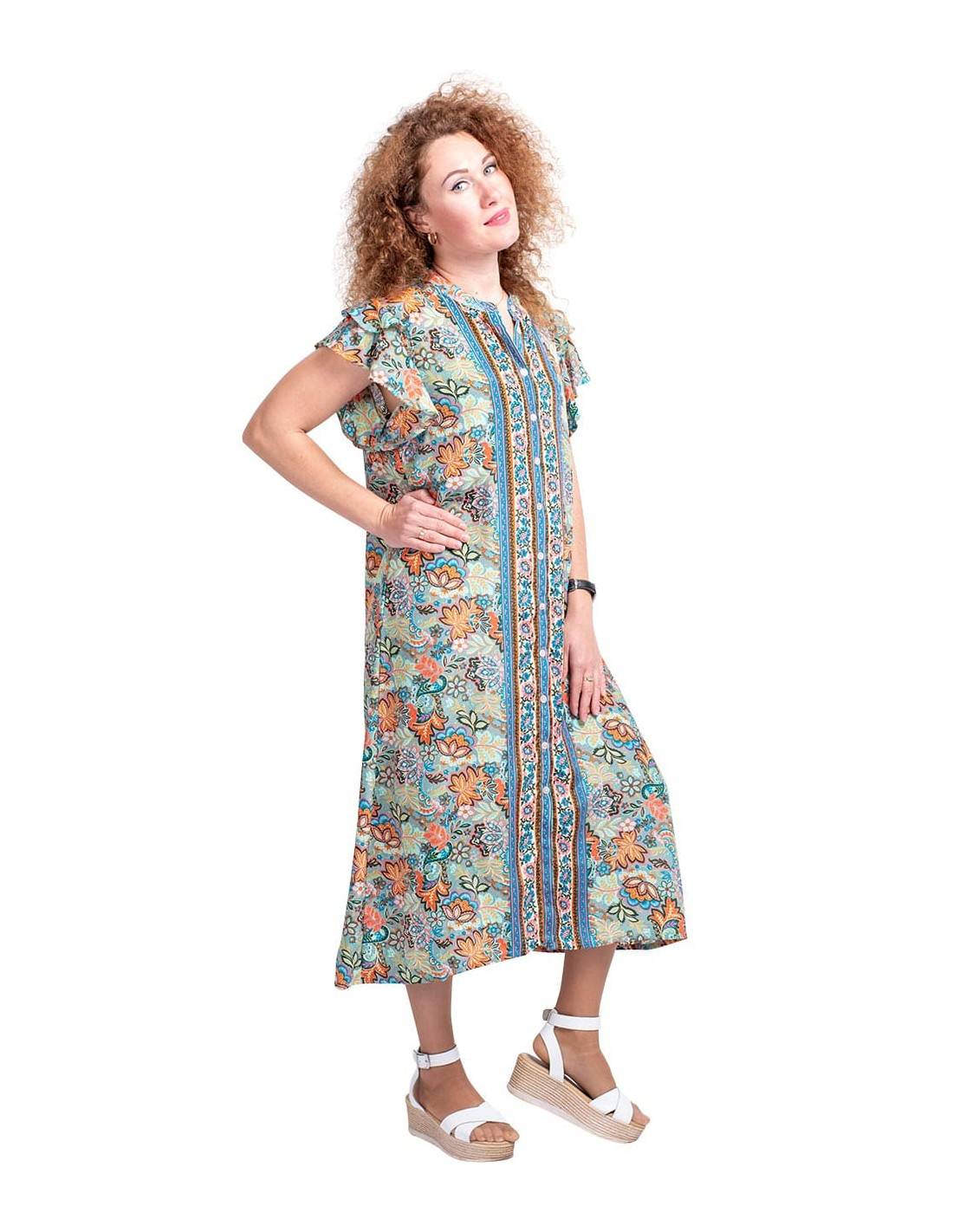 Vestido largo estilo hippie chic estampado con fondo negro y dibujos etnicos en tonos rosas y celestes