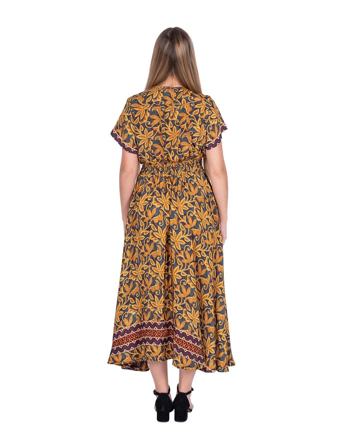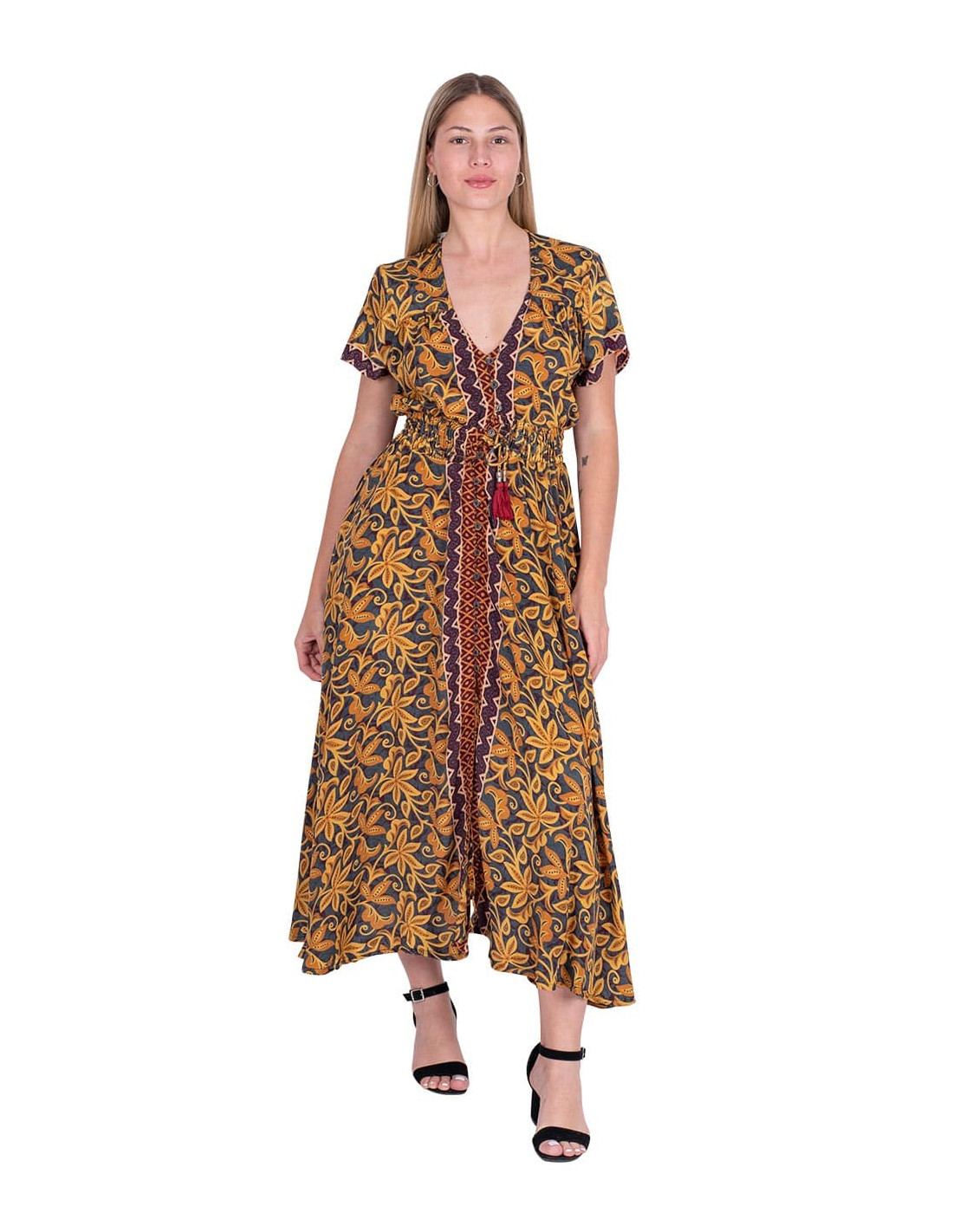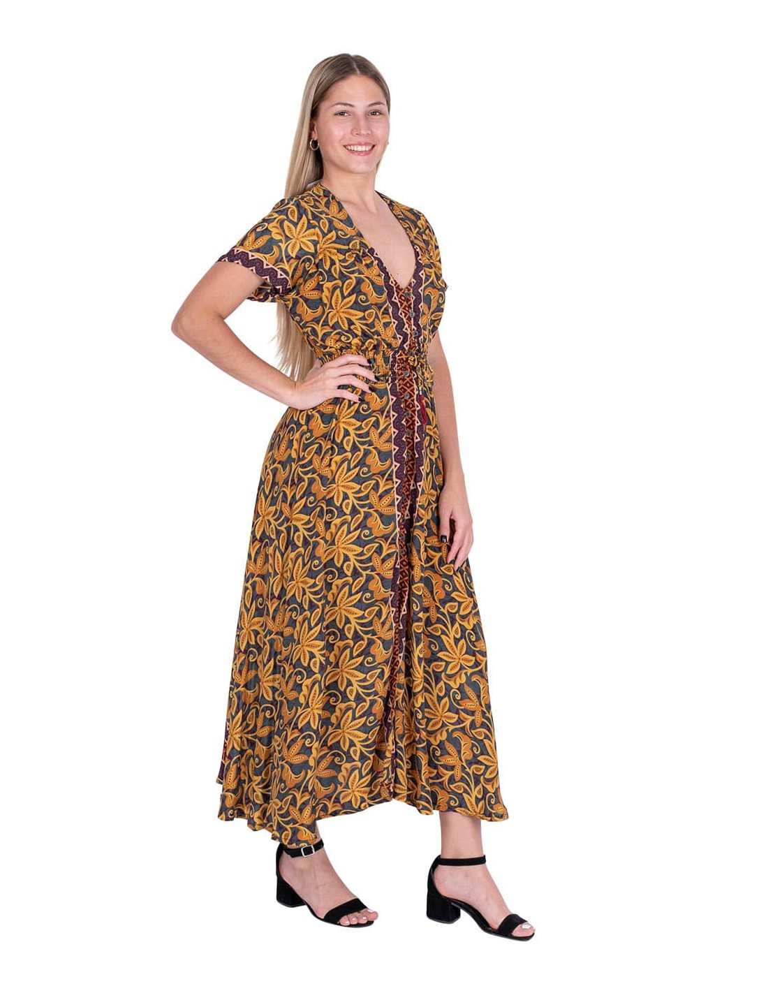 Vestido largo de talla unica amplia con mangas cortas. Fabricado en seda estampada rosa.