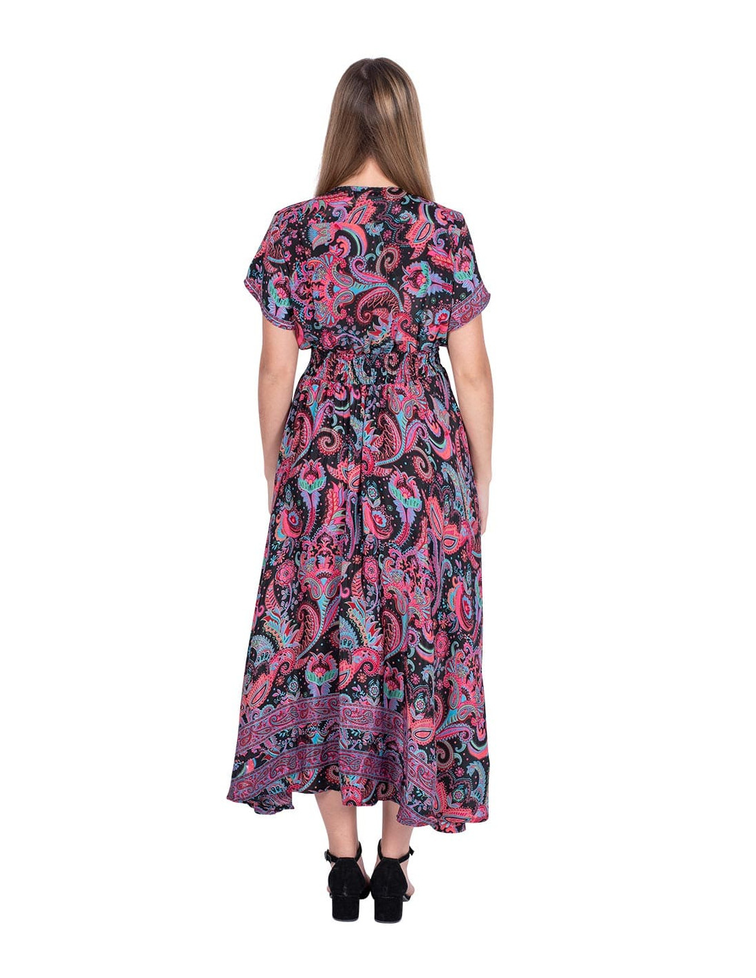 Vestido largo abotonado con mangas cortas y ajuste en la cintura