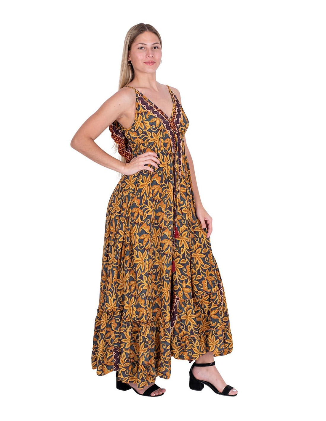 Vestido largo estampado en tonos pasteles siendo su fondo celeste