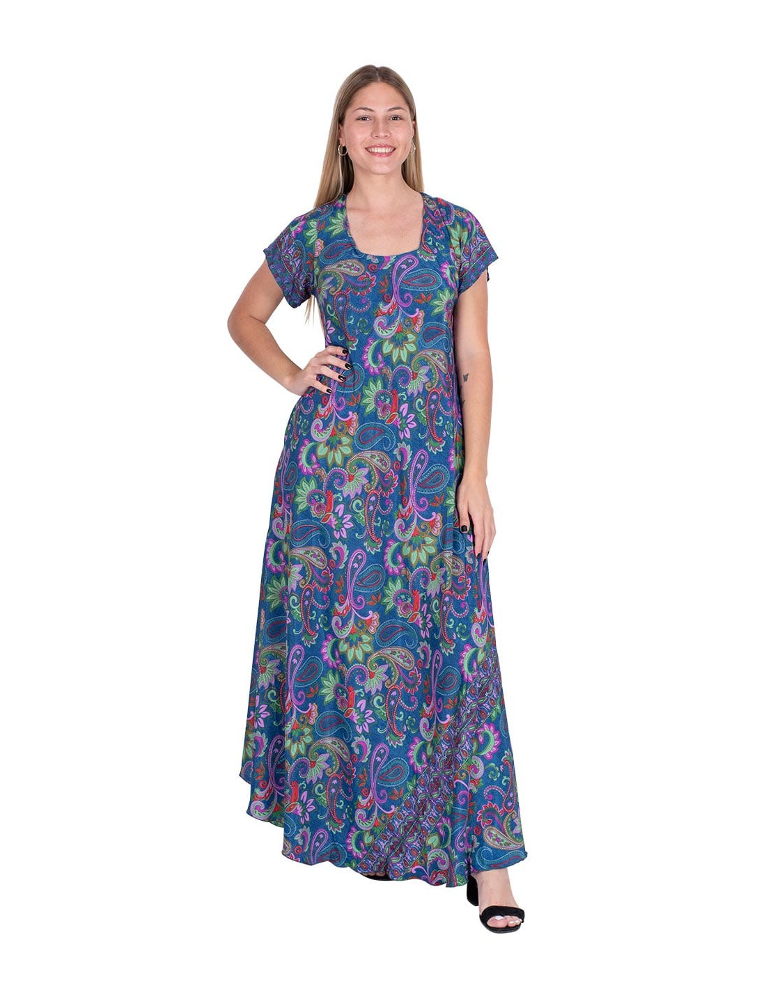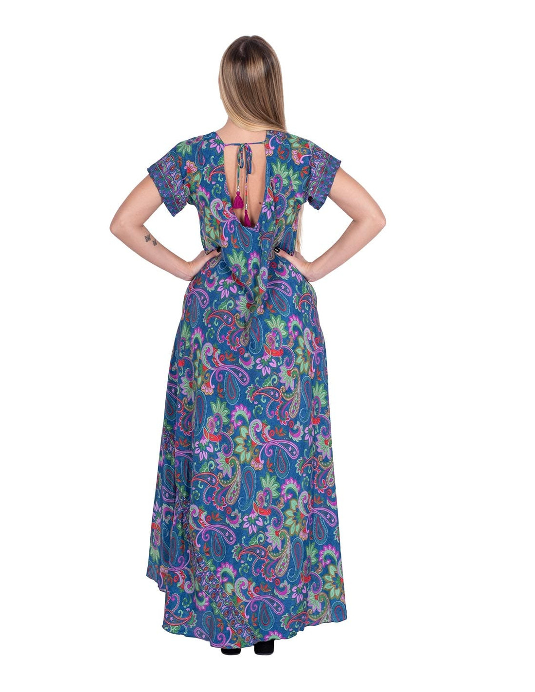 Conjunto combinado de falda corta y top fabricado en seda estampada con fondo amarillo y dibujos paisley