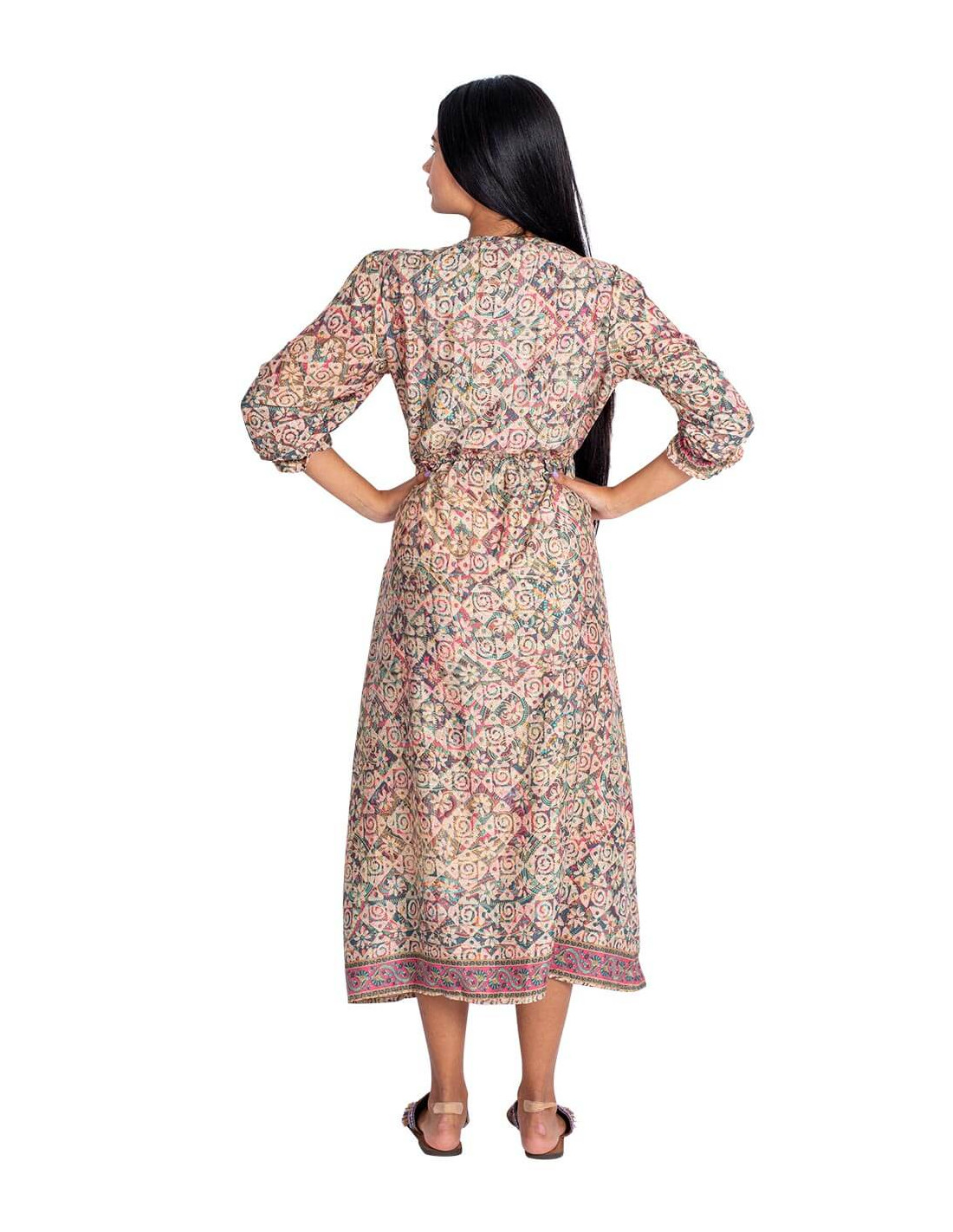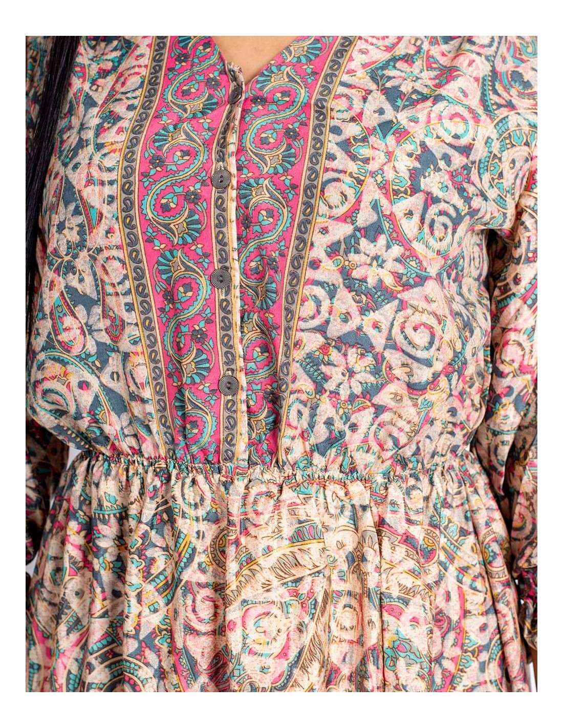 Falda larga de seda con estampado en tonos verdes con detalles en beige y rosa