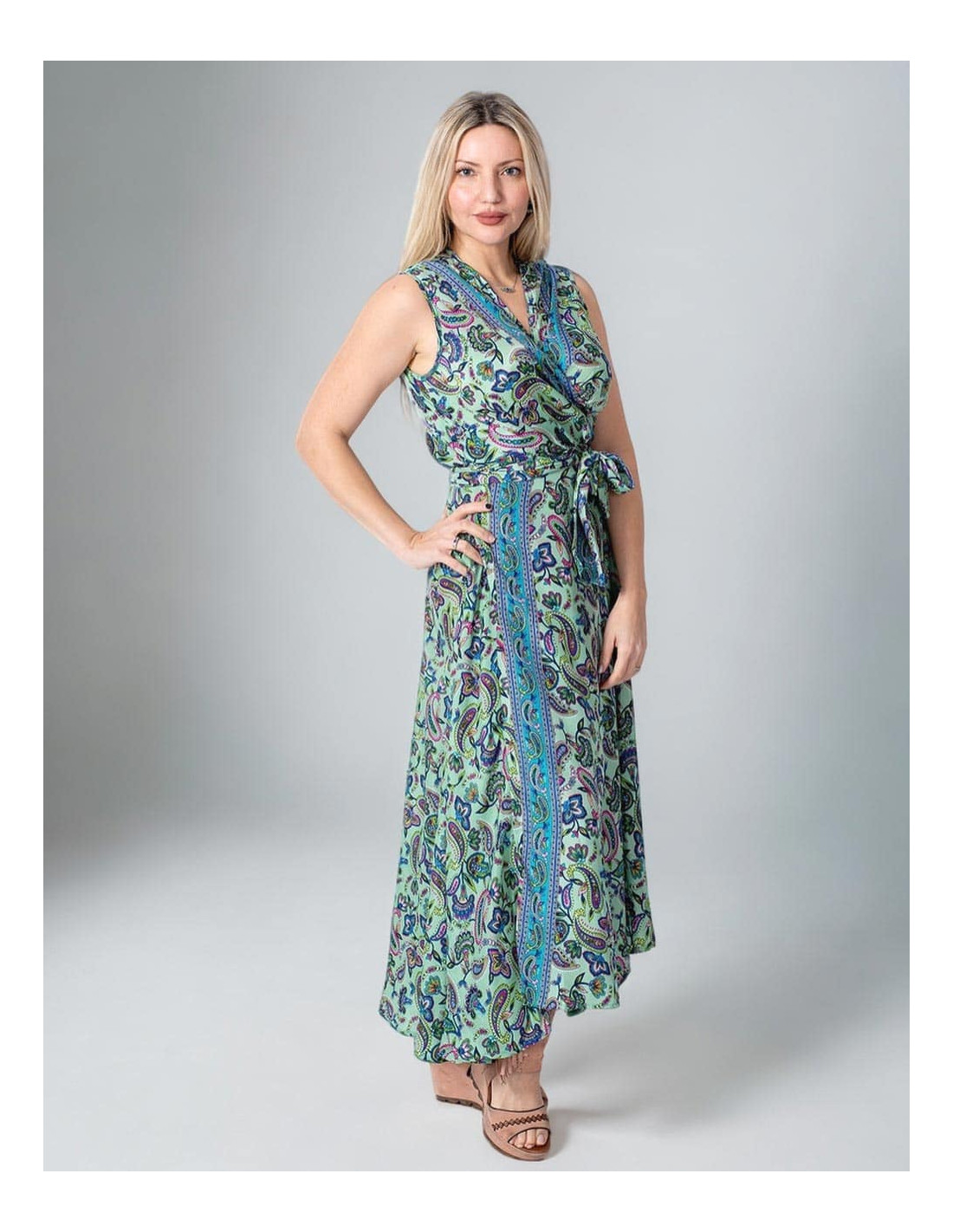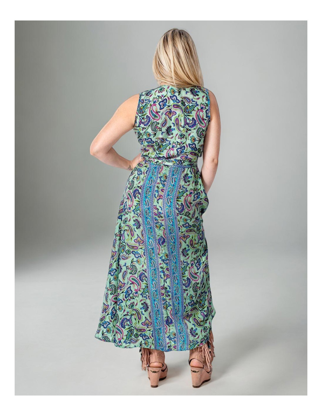 Pantalón recto y fino fabricado en seda con dibujos paisley en color azul con dibujos de flores en varios colores