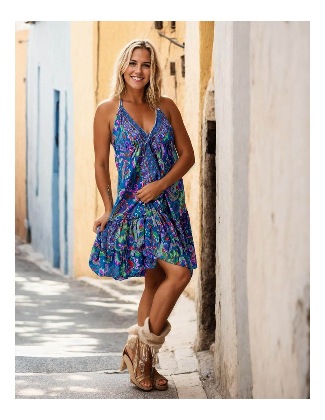 Vestido largo estampado en tonos pasteles siendo su fondo celeste