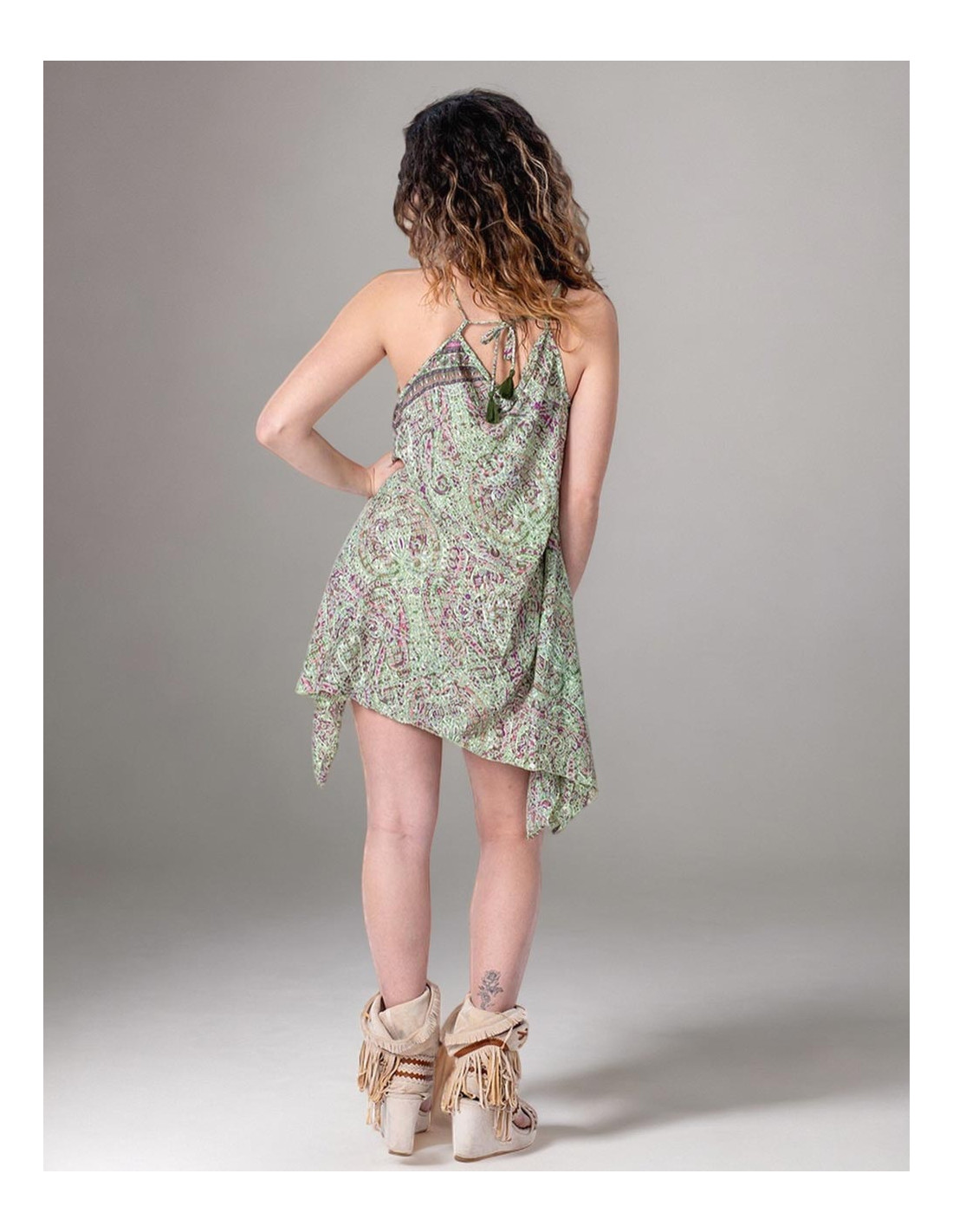 Vestido corto lazado en la nuca fabricado en seda de fondo verde claro y dibujos tonos rojos y verdes