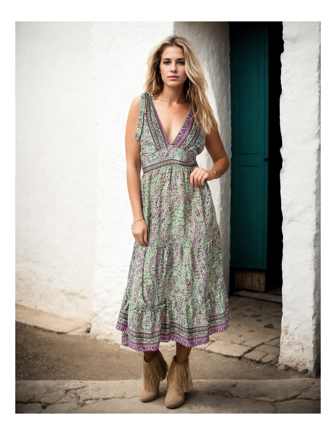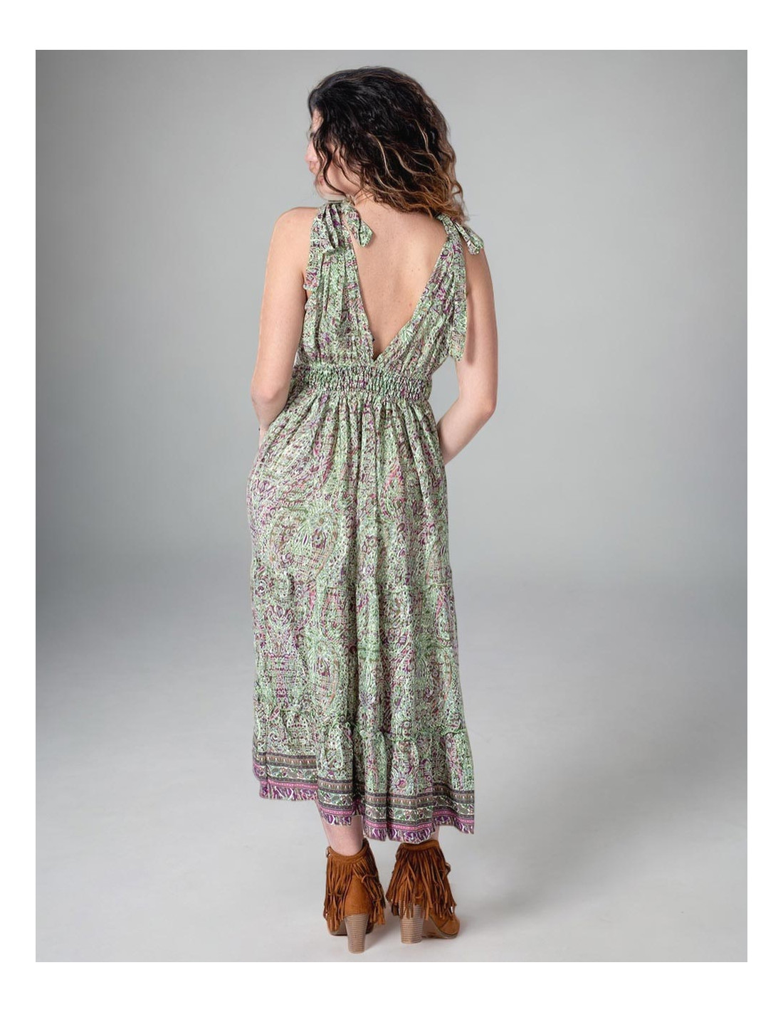 Vestido corto con tirantes anchos. Su estampado tiene el fondo marron pero gran cantidad de flores celestes que resaltan