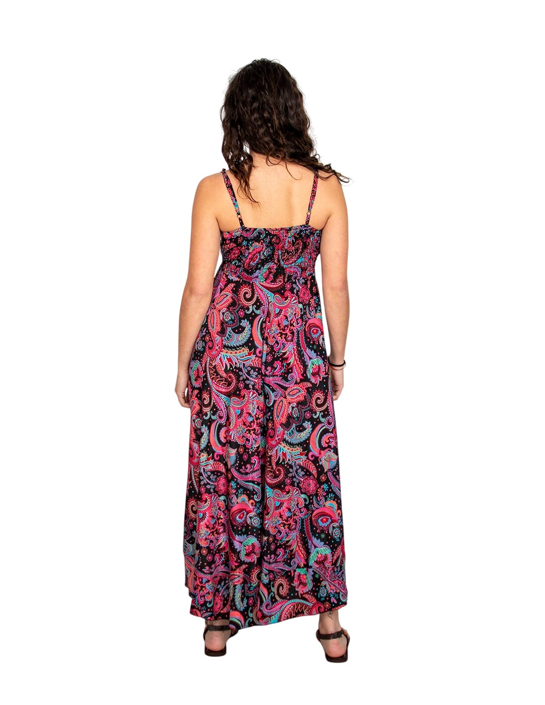 Su diseño con escote en pico, tirantes regulables y goma en la espalda lo hace adaptable, favorecedor y muy cómodo. Ceñido en la parte superior y fluido desde la cintura, acompaña cada movimiento con elegancia.